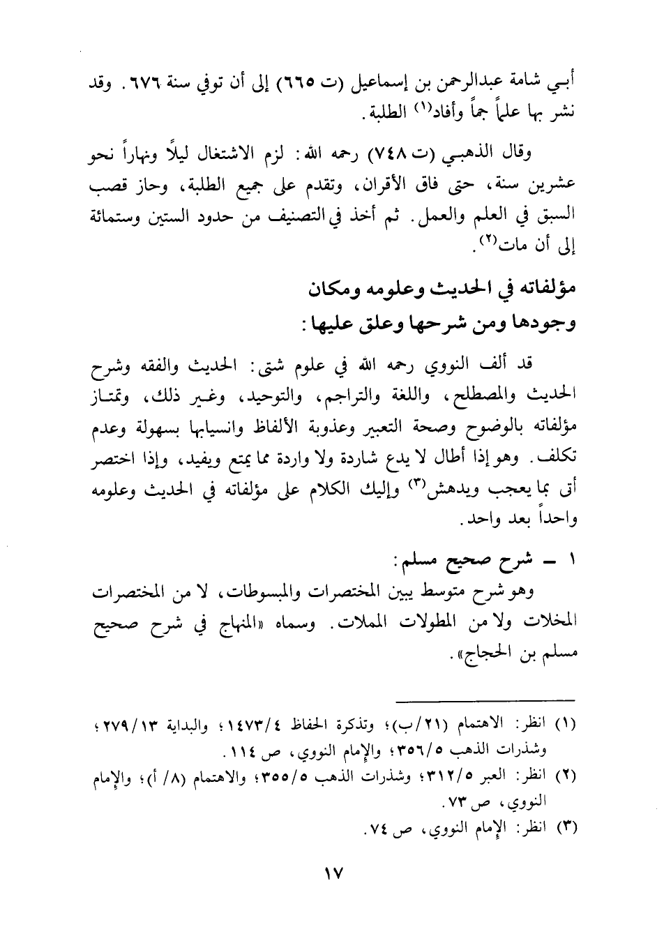 (¬1) انظر: الاهتمام (21/ ب)؛ وتذكرة الحفاظ 4/ 1473؛ والبداية 13/ 279؛ وشذرات الذهب 5/ 356؛ والإِمام النووي، ص 114.