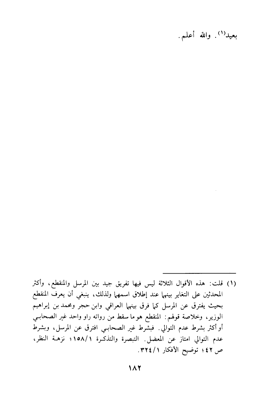 (¬1) قلت: هذه الأقوال الثلاثة ليس فيها تفريق جيد بين المرسل والمنقطع، وأكثر المحدثين على التغاير بينهما عند إطلاق اسمهما ولذلك، ينبغي أن يعرف المنقطع بحيث يفترق عن المرسل كما فرق بينهما العراقي وابن حجر ومحمد بن إبراهيم الوزير، وخلاصة قولهم: المنقطع هو ما سقط من رواته راو واحد غير الصحابي أو أكثر بشرط عدم التوالي. فبشرط غير الصحابي افترق عن المرسل، وبشرط عدم التوالي امتاز عن المعضل. التبصرة والتذكرة 1/ 158؛ نزهة النظر، ص 42؛ توضيح الأفكار 1/ 324.