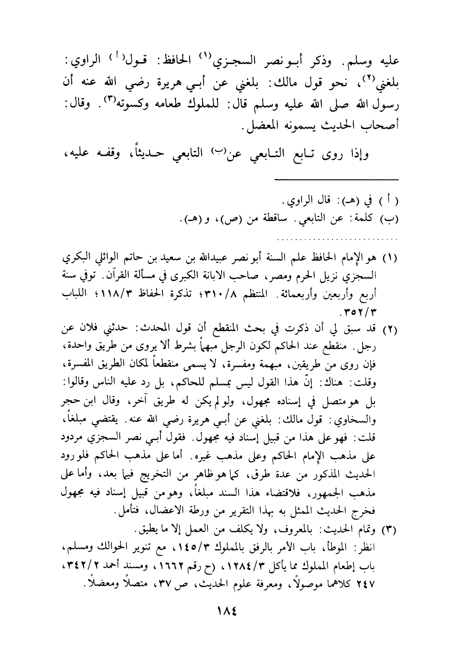 (¬2) قد سبق لي أن ذكرت في بحث المنقطع أن قول المحدث: حدثني فلان عن رجل. منقطع عند الحاكم لكون الرجل مبهمًا بشرط ألا يروى من طريق واحدة، فإن روى من طريقين، مبهمة ومفسرة، لا يسمى منقطعًا لمكان الطريق المفسرة، وقلت: هناك: إنّ هذا القول ليس بمسلم للحاكم، بل رد عليه الناس وقالوا: بل هو متصل في إسناده مجهول، ولو لم يكن له طريق آخر، وقال ابن حجر والسخاوي: قول مالك: بلغني عن أبي هريرة رضي الله عنه. يقتضي مبلغًا، قلت: فهو على هذا من قبيل إسناد فيه مجهول. فقول أبي نصر السجزي مردود على مذهب الإمام الحاكم وعلى مذهب غيره. أما على مذهب الحاكم فلورود الحديث المذكور من عدة طرق، كما هو ظاهر من التخريج فيما بعد، وأما على مذهب الجمهور، فلاقتضاء هذا السند مبلغًا، وهو من قبيل إسناد فيه مجهول فخرج الحديث الممثل به بهذا التقرير من ورطة الاعضال، فتأمل.