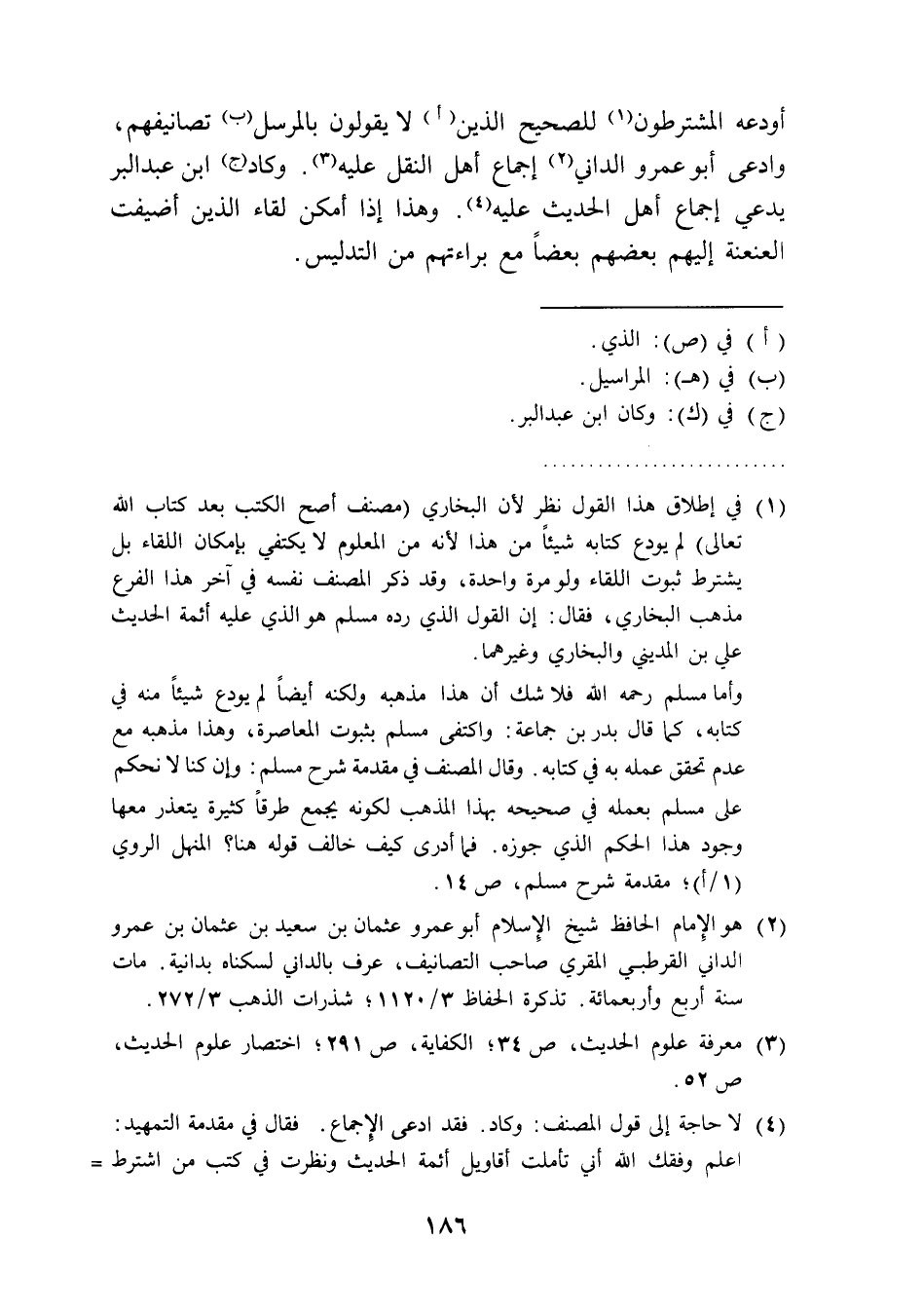 أودعه المشترطون (¬1) للصحيح الذين (أ) لا يقولون بالمرسل (ب) تصانيفهم، وادعى أبو عمرو الداني (¬2) إجماع أهل النقل عليه (¬3). وكاد (ج) ابن عبد البر يدعي إجماع أهل الحديث عليه (¬4). وهذا إذا أمكن لقاء الذين أضيفت العنعنة إليهم بعضهم بعضًا مع براءتهم من التدليس.