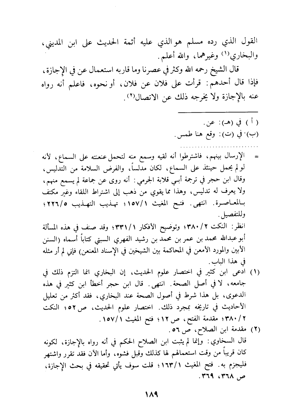 انظر: النكت 2/ 380؛ وتوضيح الأفكار 1/ 331؛ وقد صنف في هذه المسألة أبو عبد الله محمد بن عمر بن محمد بن رشيد الفهري السبتي كتابًا أسماه (السنن الأبين والمورد الأمعن في المحاكمة بين الشيخين في الإِسناد المعنعن) فإني لم أر مثله في هذا الباب.