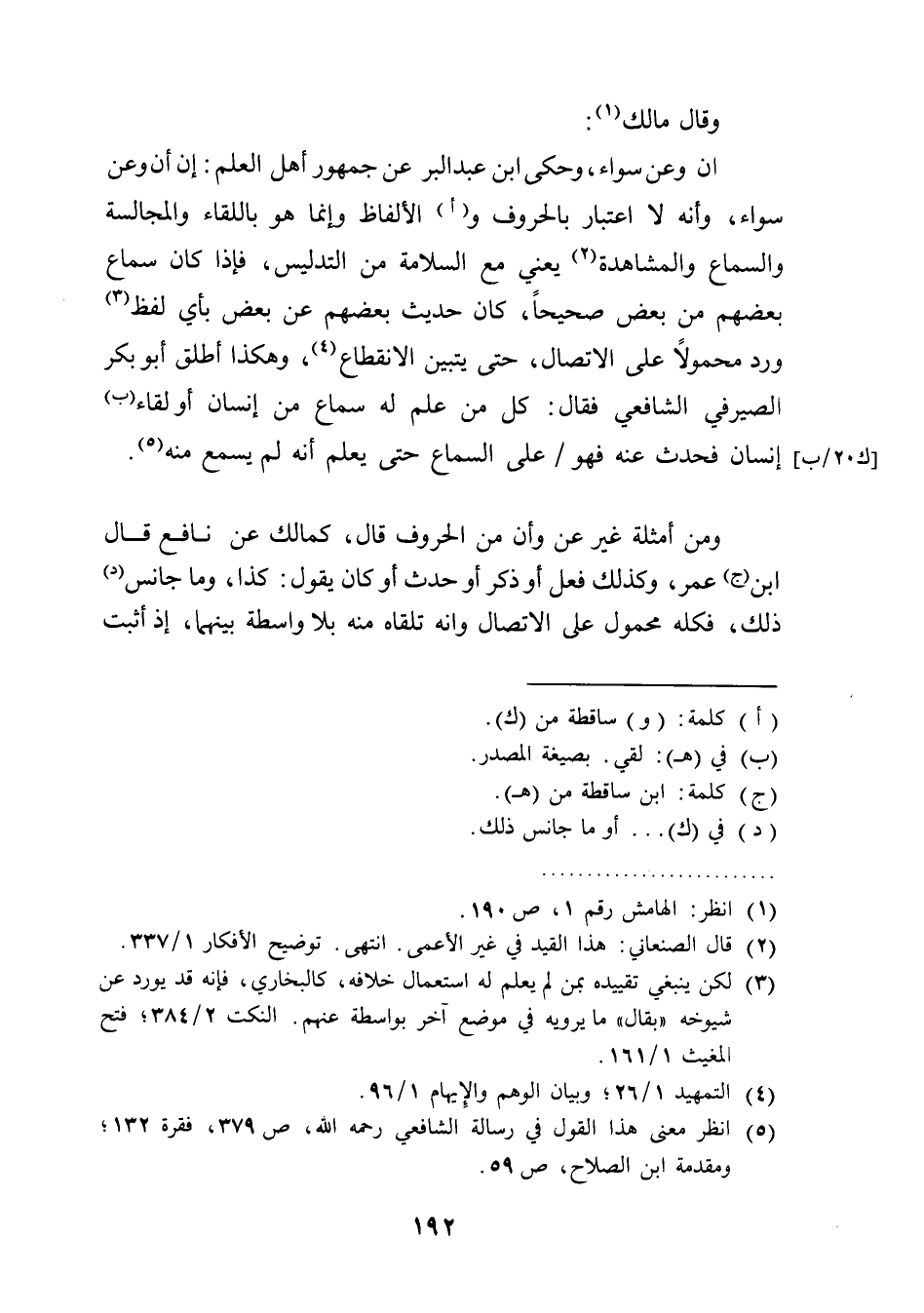 ومن أمثلة غير عن وأن من الحروف قال، كمالك عن نافع قال ابن (ج) عمر، وكذلك فعل أو ذكر أو حدث أو كان يقول: كذا، وما جانس (د) ذلك، فكله محمول على الاتصال وانه تلقاه منه بلا واسطة بينهما، إذ أثبت