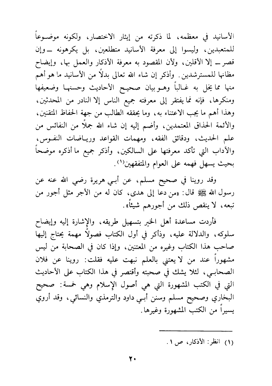 الأسانيد في معظمه، لما ذكرته من إيثار الاختصار، ولكونه موضوعًا للمتعبدين، وليسوا إلى معرفة الأسانيد متطلعين، بل يكرهونه - وإن قصر - إلا الأقلين، ولأن المقصود به معرفة الأذكار والعمل بها، وإيضاح مظانها للمسترشدين. وأذكر إن شاء الله تعالى بدلًا من الأسانيد ما هو أهم منها مما يخل به غالبًا وهو بيان صحيح الأحاديث وحسنها وضعيفها ومنكرها، فإنه مما يفتقر إلى معرفته جميع الناس إلا النادر من المحدثين، وهذا أهم ما يجب الاعتناء به، وما يحققه الطالب من جهة الحفاظ المتقنين، والأئمة الحذاق المعتمدين، وأضم إليه إن شاء الله جملًا من النفائس من علم الحديث، ودقائق الفقه، ومهمات القواعد ورياضات النفوس، والآداب التي تأكد معرفتها على السالكين، وأذكر جميع ما أذكره موضحًا بحيث يسهل فهمه على العوام والمتفقهين (¬1).