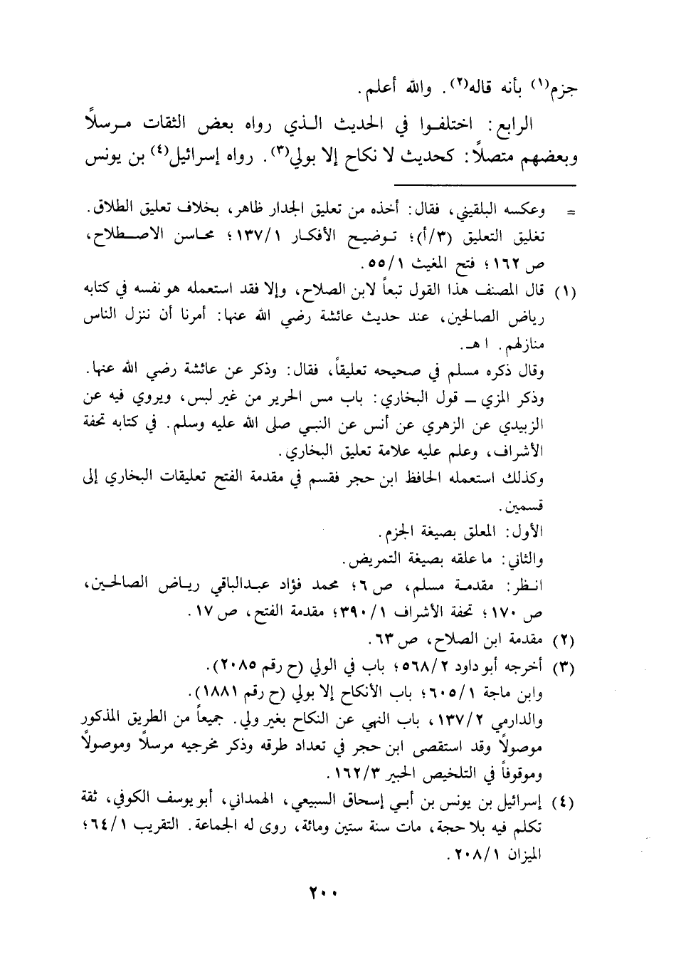الرابع: اختلفوا في الحديث الذي رواه بعض الثقات مرسلًا وبعضهم متصلًا: كحديث لا نكاح إلا بولي (¬3). رواه إسرائيل (¬4) بن يونس