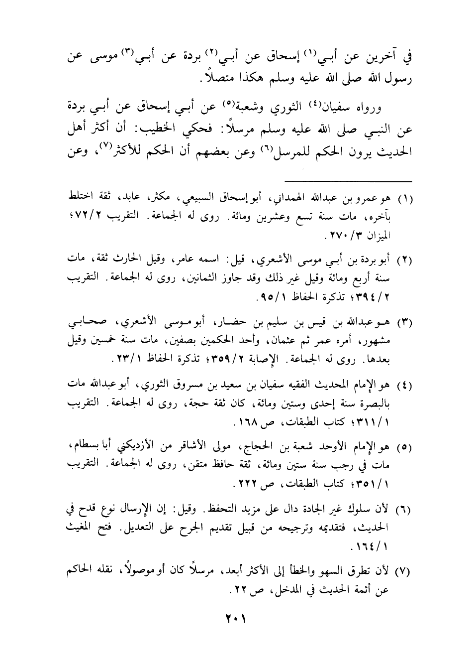 (¬7) لأن تطرق السهو والخطأ إلى الأكثر أبعد، مرسلًا كان أو موصولًا، نقله الحاكم عن أئمة الحديث في المدخل، ص 22.