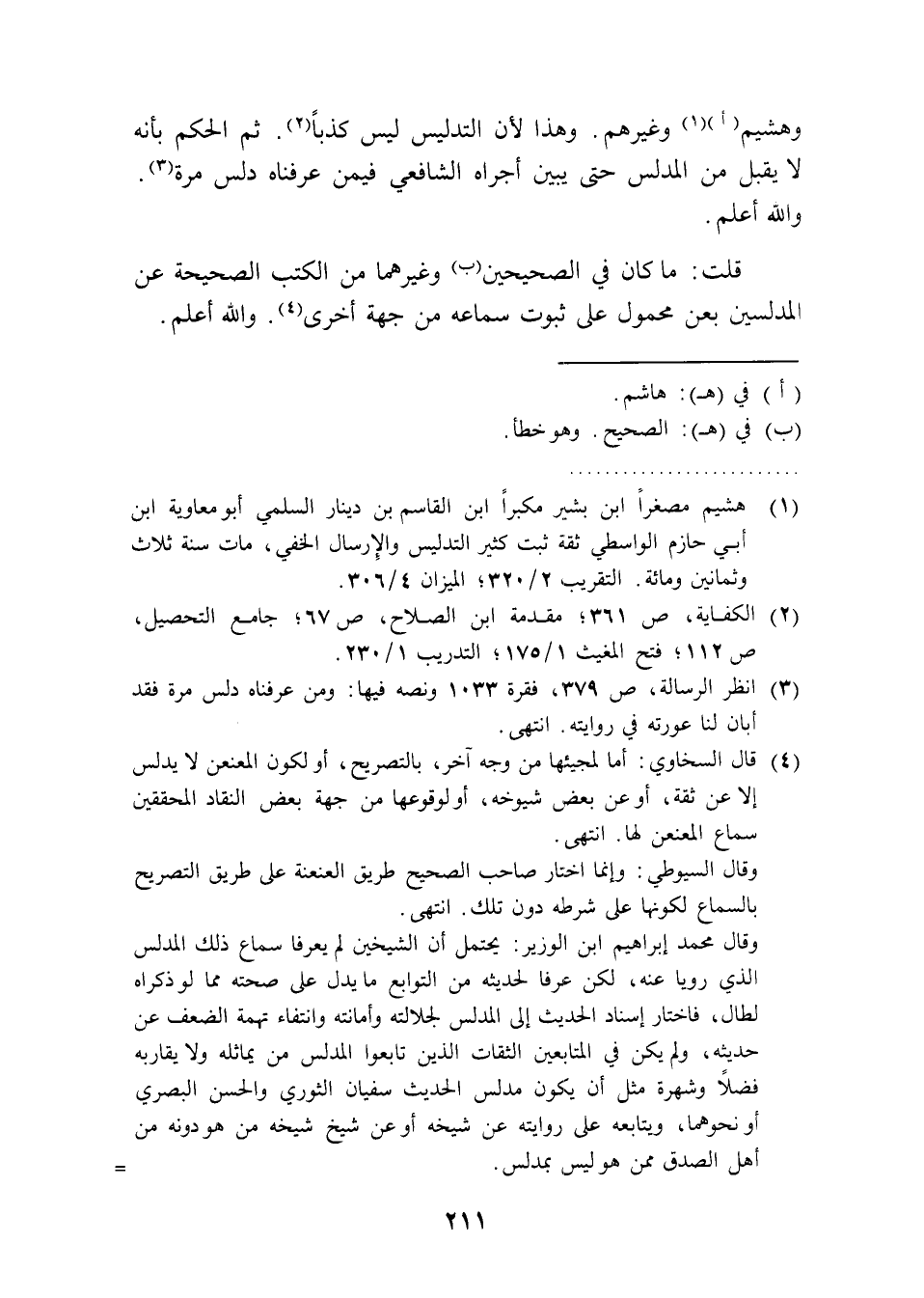 وقال محمد إبراهيم ابن الوزير: يحتمل أن الشيخين لم يعرفا سماع ذلك المدلس الذي رويا عنه، لكن عرفا لحديثه من التوابع ما يدل على صحته مما لو ذكراه لطال، فاختار إسناد الحديث إلى المدلس لجلالته وأمانته وانتفاء تهمة الضعف عن حديثه، ولم يكن في المتابعين الثقات الذين تابعوا المدلس من يماثله ولا يقاربه فضلًا وشهرة مثل أن يكون مدلس الحديث سفيان الثوري والحسن البصري أو نحوهما، ويتابعه على روايته عن شيخه أو عن شيخ شيخه من هو دونه من أهل الصدق ممن هو ليس بمدلس. =