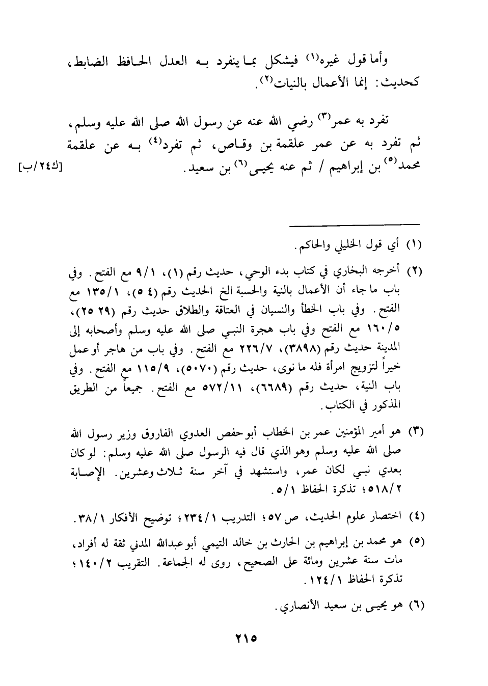 تفرد به عمر (¬3) رضي الله عنه عن رسول الله صلى الله عليه وسلم، ثم تفرد به عن عمر علقمة بن وقاص، ثم تفرد (¬4) به عن علقمة محمد (¬5) بن إبراهيم ثم عنه يحيى (¬6) بن سعيد.