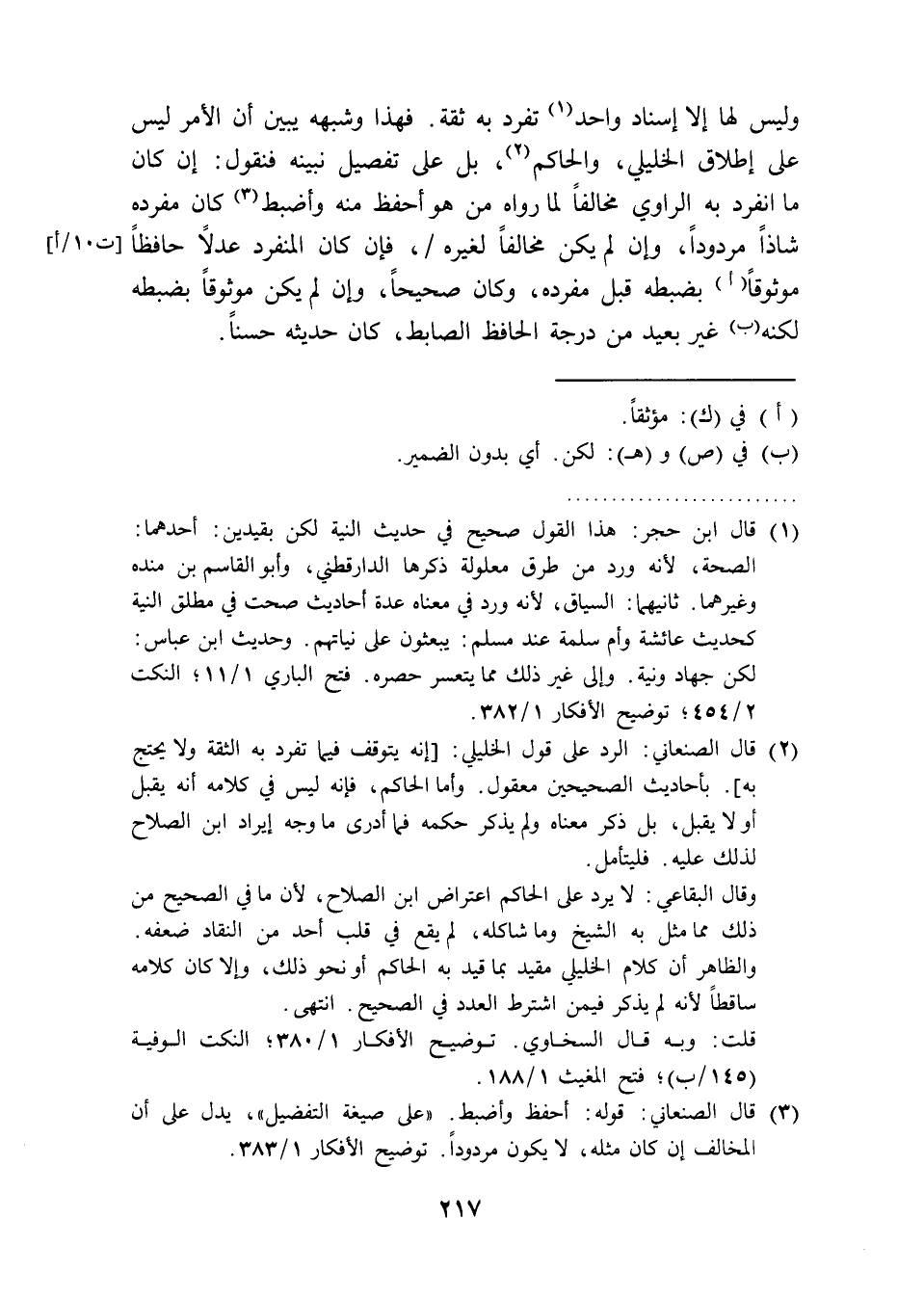 (¬2) قال الصنعاني: الرد على قول الخليلي: [إنه يتوقف فيما تفرد به الثقة ولا يحتج به]. بأحاديث الصحيحين معقول. وأما الحاكم، فإنه ليس في كلامه أنه يقبل أو لا يقبل، بل ذكر معناه ولم يذكر حكمه فما أدرى ما وجه إيراد ابن الصلاح لذلك عليه. فليتأمل.