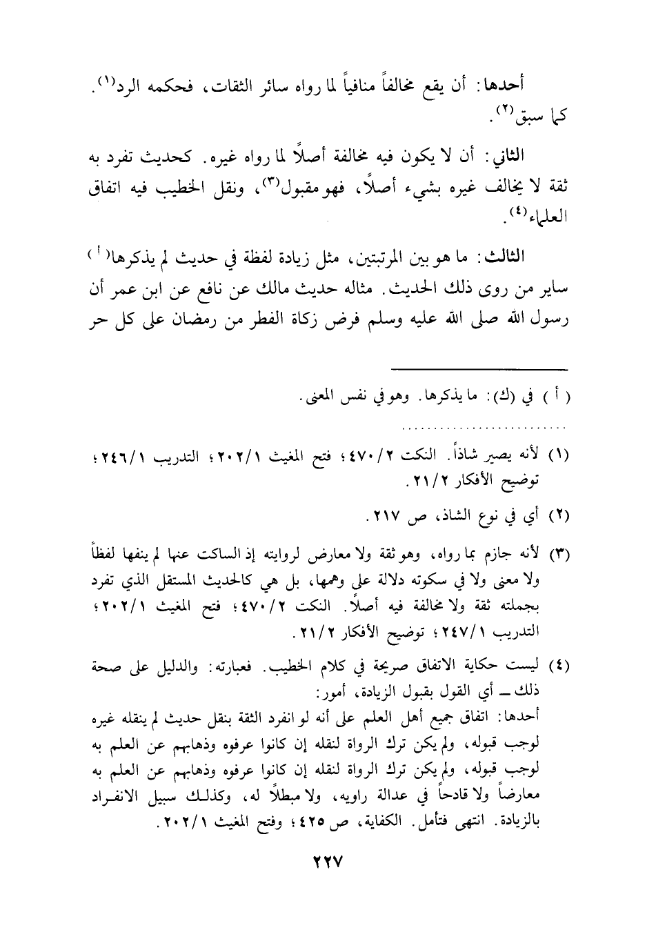 الثالث: ما هو بين المرتبتين، مثل زيادة لفظة في حديث لم يذكرها (أ) ساير من روى ذلك الحديث. مثاله حديث مالك عن نافع عن ابن عمر أن رسول الله صلى الله عليه وسلم فرض زكاة الفطر من رمضان على كل حر