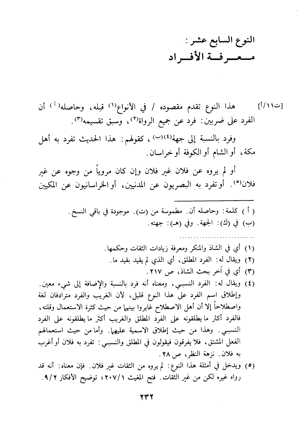 هذا النوع تقدم مقصوده في الأنواع (¬1) قبله، وحاصله (أ) أن الفرد على ضربين: فرد عن جميع الرواة (¬2)، وسبق تقسيمه (¬3).