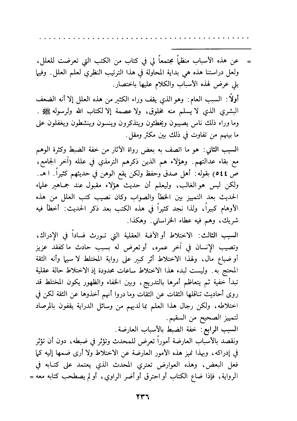 = عن هذه الأسباب منظمًا مجتمعًا لي في كتاب من الكتب التي تعرضت للعلل، ولعل دراستنا هذه هي بداية المحاولة في هذا الترتيب النظري لعلم العلل. وفيما يلي عرض لهذه الأسباب والكلام عليها باختصار.