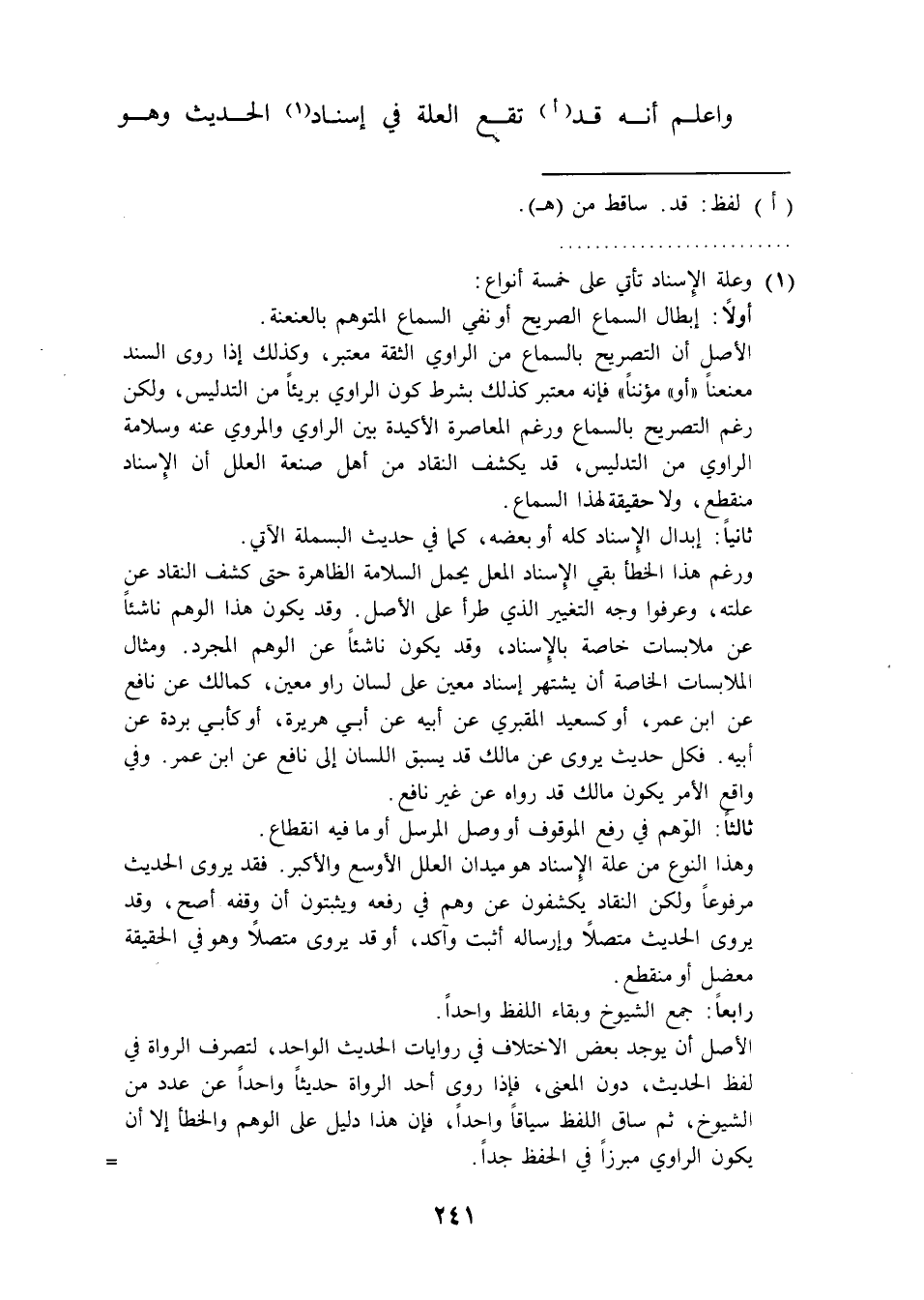 وهذا النوع من علة الإِسناد هو ميدان العلل الأوسع والأكبر. فقد يروى الحديث مرفوعًا ولكن النقاد يكشفون عن وهم في رفعه ويثبتون أن وقفه أصح، وقد يروى الحديث متصلًا وإرساله أثبت وآكد، أو قد يروى متصلًا وهو في الحقيقة معضل أو منقطع.