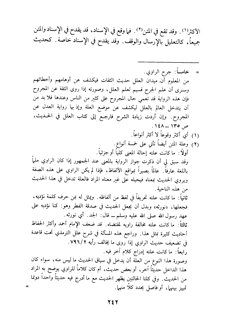 وقد سبق لي أن ذكرت جواز الرواية بالمعنى عند الجمهور إذا كان الراوي ملمًا باللغة عارفًا. عالمًا بصيرًا بمواقع الألفاظ، فإذا لم يكن الراوي على هذه الصفة ويروي الحديث بمعناه فيحيله على غير معناه المراد فالعلة تدخل في هذا الحديث من هذه الناحية.