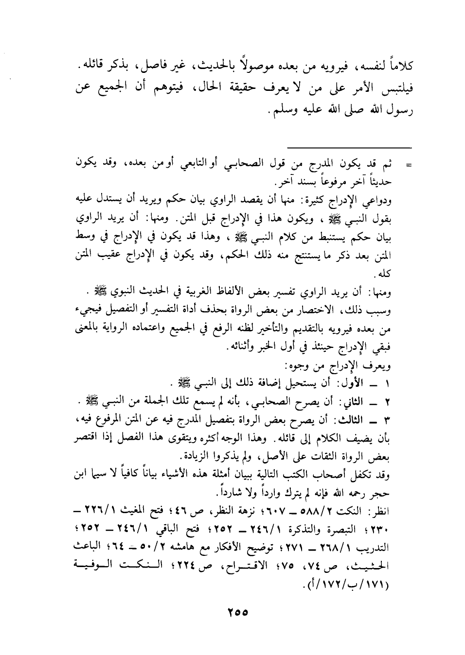 = ثم قد يكون المدرج من قول الصحابي أو التابعي أو من بعده، وقد يكون حديثًا آخر مرفوعًا بسند آخر.