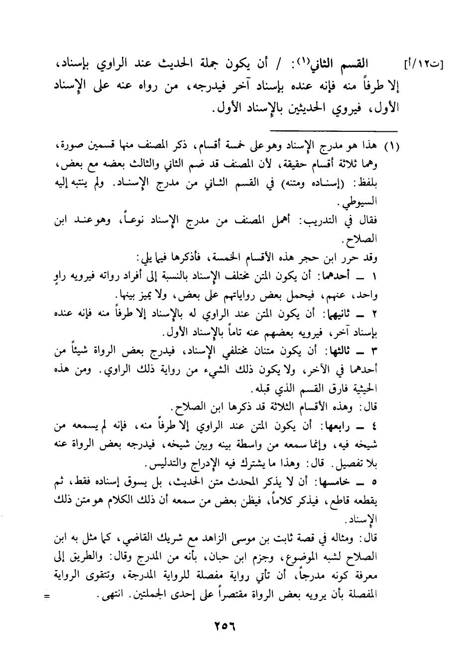 (¬1) هذا هو مدرج الإِسناد وهو على خمسة أقسام، ذكر المصنف منها قسمين صورة، وهما ثلاثة أقسام حقيقة، لأن المصنف قد ضم الثاني والثالث بعضه مع بعض، بلفظ: (إسناده ومتنه) في القسم الثاني من مدرج الإِسناد. ولم ينتبه إليه السيوطي.