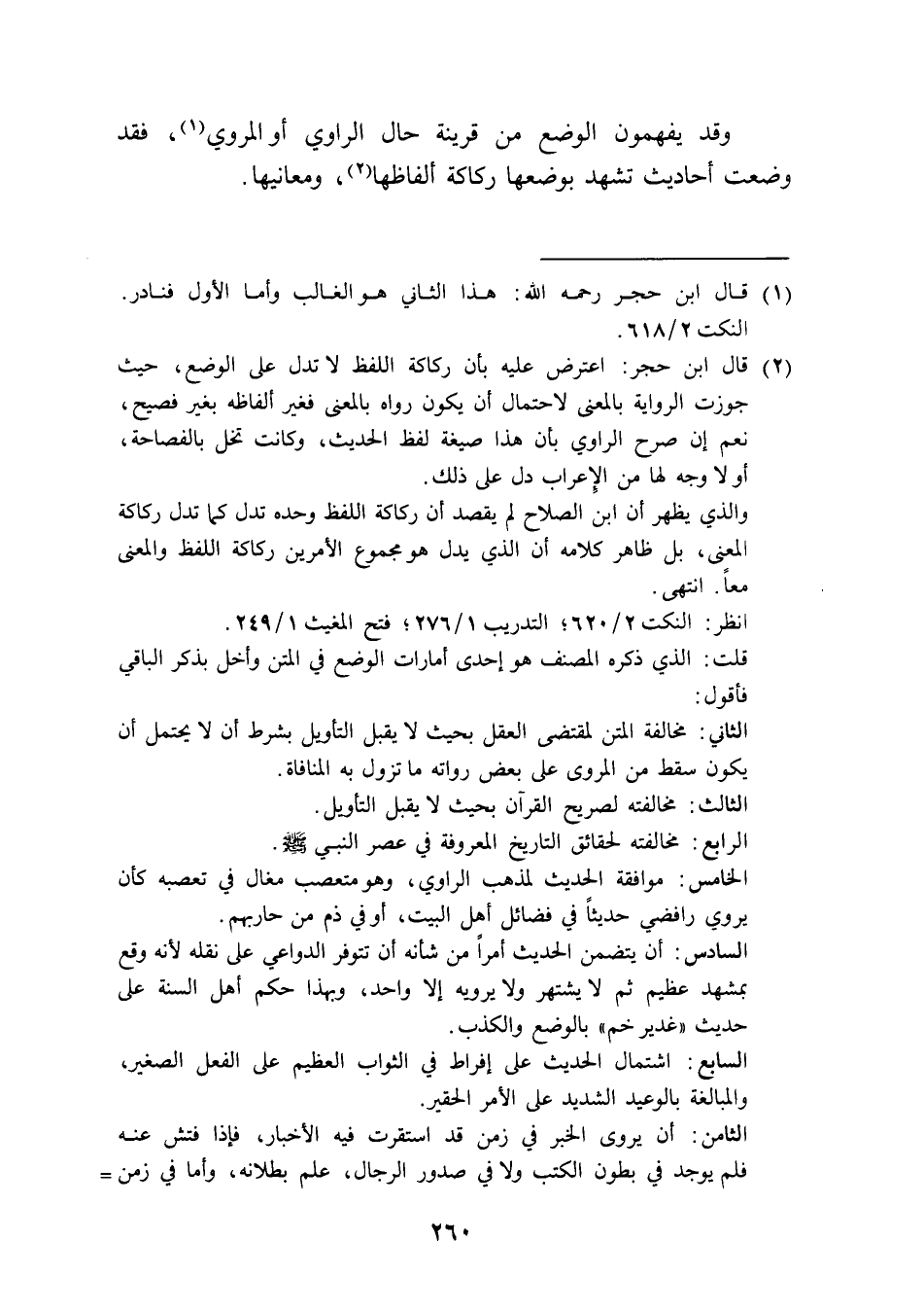 (¬2) قال ابن حجر: اعترض عليه بأن ركاكة اللفظ لا تدل على الوضع، حيث جوزت الرواية بالمعنى لاحتمال أن يكون رواه بالمعنى فغير ألفاظه بغير فصيح، نعم إن صرح الراوي بأن هذا صيغة لفظ الحديث، وكانت تخل بالفصاحة، أو لا وجه لها من الإِعراب دل على ذلك.