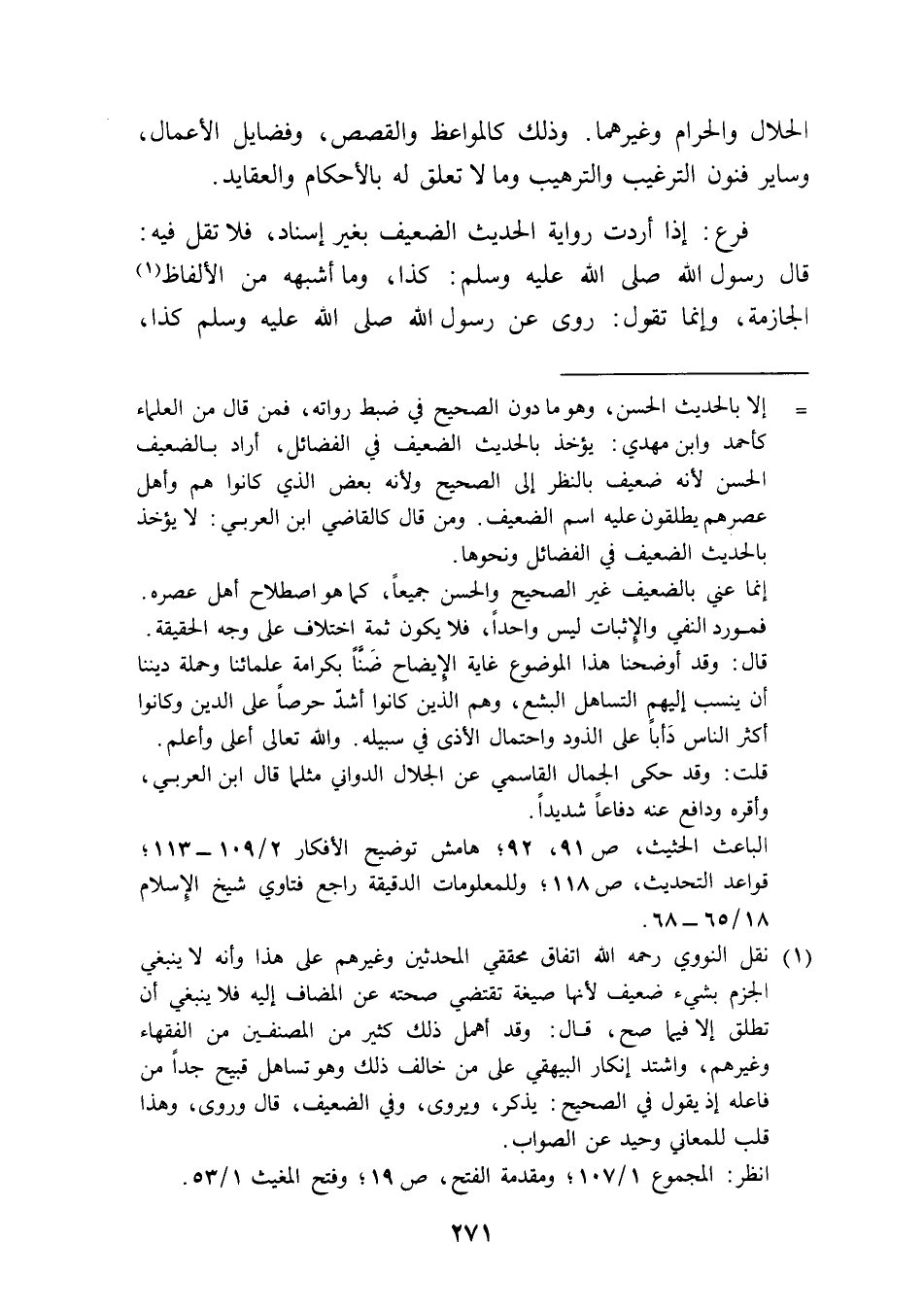(¬1) نقل النووي رحمه الله اتفاق محققي المحدثين وغيرهم على هذا وأنه لا ينبغي الجزم بشيء ضعيف لأنها صيغة تقتضي صحته عن المضاف إليه فلا ينبغي أن تطلق إلا فيما صح، قال: وقد أهمل ذلك كثير من المصنفين من الفقهاء وغيرهم، واشتد إنكار البيهقي على من خالف ذلك وهو تساهل قبيح جدًا من فاعله إذ يقول في الصحيح: يذكر، ويروى، وفي الضعيف، قال وروى، وهذا قلب للمعاني وحيد عن الصواب.