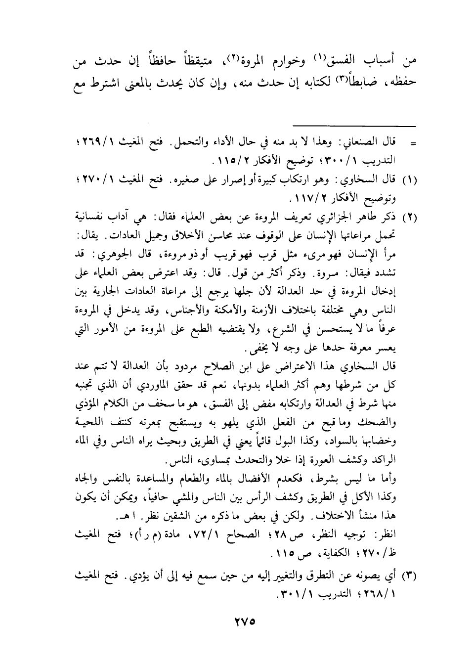 = قال الصنعاني: وهذا لا بد منه في حال الأداء والتحمل. فتح المغيث 1/ 269؛ التدريب 1/ 300؛ توضيح الأفكار 2/ 115.