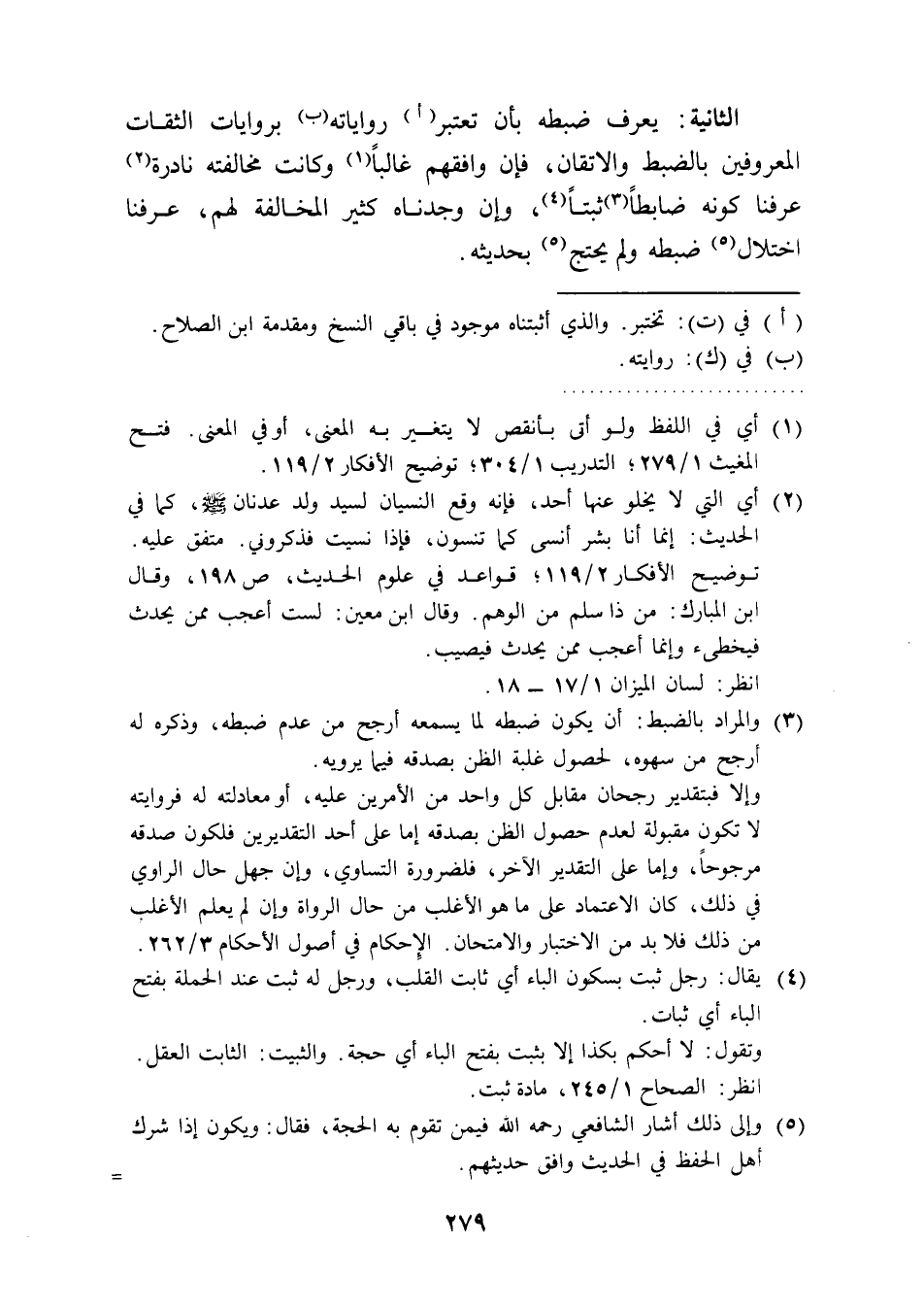 الثانية: يعرف ضبطه بأن تعتبر (أ) رواياته (ب) بروايات الثقات المعروفين بالضبط والاتقان، فإن وافقهم غالبًا (¬1) وكانت مخالفته نادرة (¬2) عرفنا كونه ضابطًا (¬3) ثبتًا (¬4)، وإن وجدناه كثير المخالفة لهم، عرفنا اختلال (5) ضبطه ولم يحتج (¬5) بحديثه.