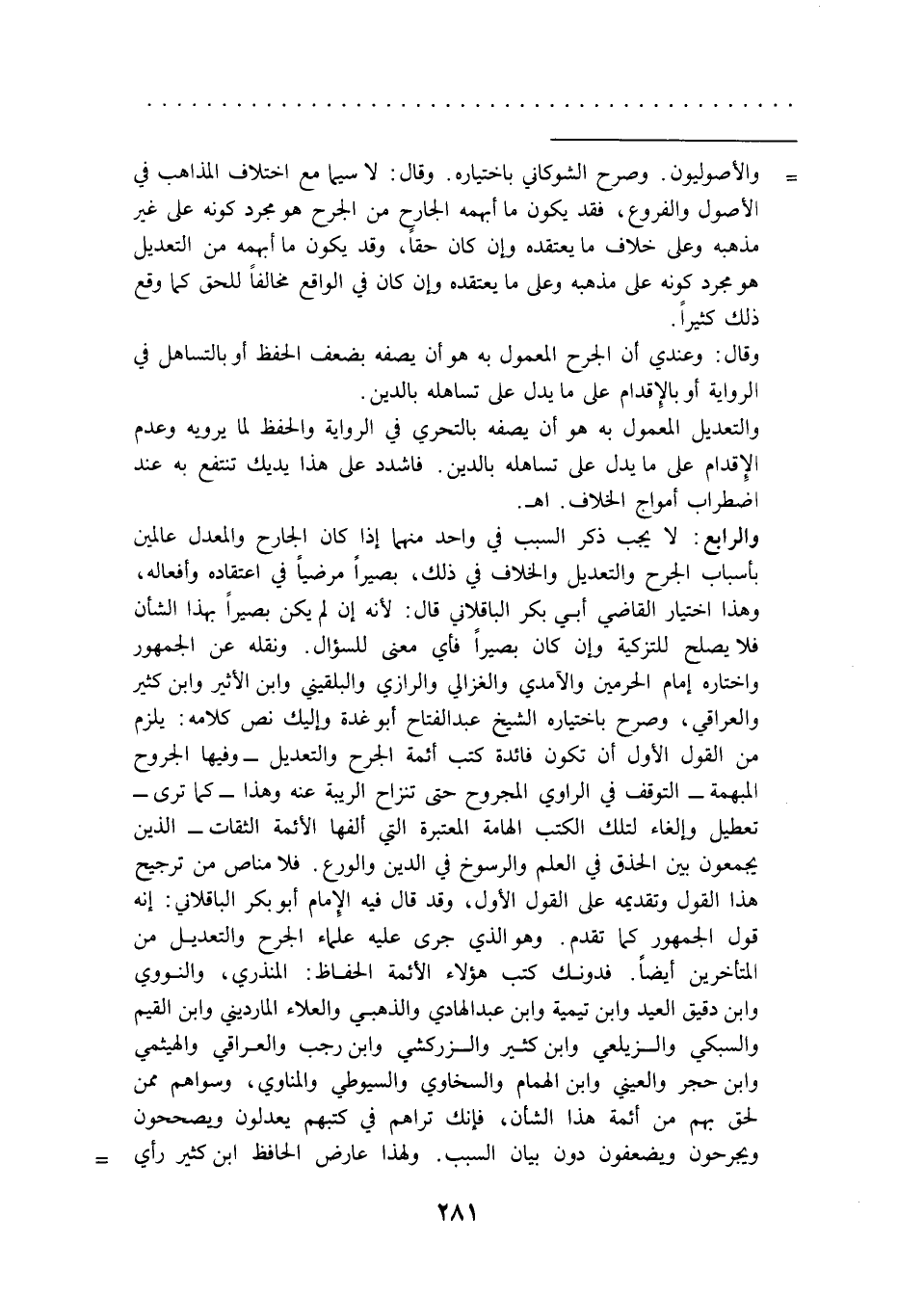 = والأصوليون. وصرح الشوكاني باختياره. وقال: لا سيما مع اختلاف المذاهب في الأصول والفروع، فقد يكون ما أبهمه الجارح من الجرح هو مجرد كونه على غير مذهبه وعلى خلاف ما يعتقده وإن كان حقًا، وقد يكون ما أبهمه من التعديل هو مجرد كونه على مذهبه وعلى ما يعتقده وإن كان في الواقع مخالفًا للحق كما وقع ذلك كثيرًا.