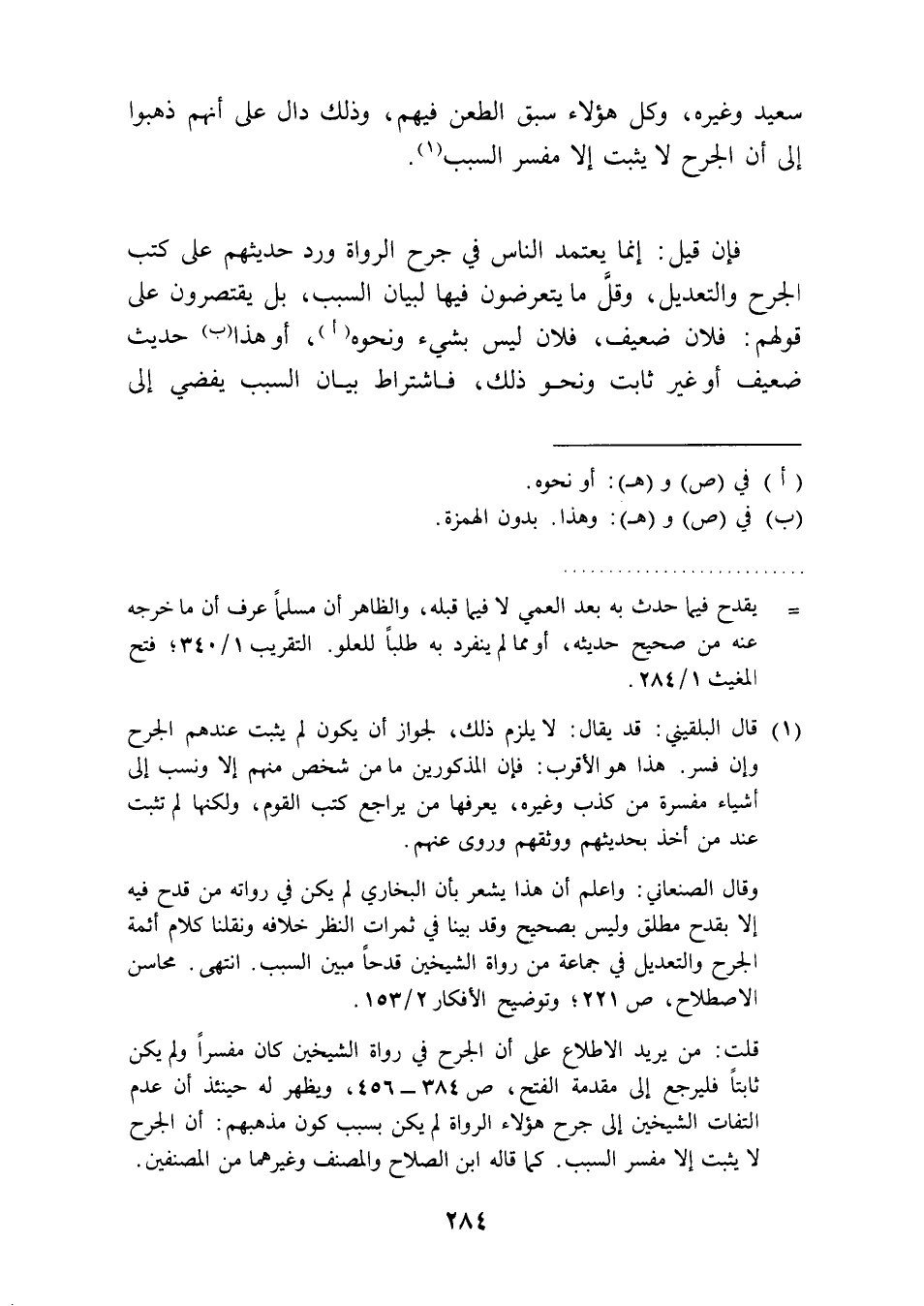 قلت: من يريد الاطلاع على أن الجرح في رواة الشيخين كان مفسرًا ولم يكن ثابتًا فليرجع إلى مقدمة الفتح، ص 384 - 456، ويظهر له حينئذ أن عدم التفات الشيخين إلى جرح هؤلاء الرواة لم يكن بسبب كون مذهبهم: أن الجرح لا يثبت إلا مفسر السبب. كما قاله ابن الصلاح والمصنف وغيرهما من المصنفين.