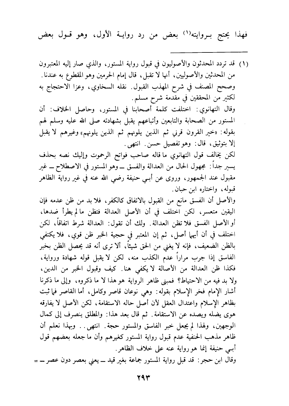 لكن يخالف قول التهانوي ما قاله صاحب فواتح الرحموت وإليك نصه بحذف يسير جدًا: مجهول الحال من العدالة والفسق - وهو المستور في الاصطلاح - غير مقبول عند الجمهور، وروى عن أبي حنيفة رضي الله عنه في غير رواية الظاهر قبوله، واختاره ابن حبان.