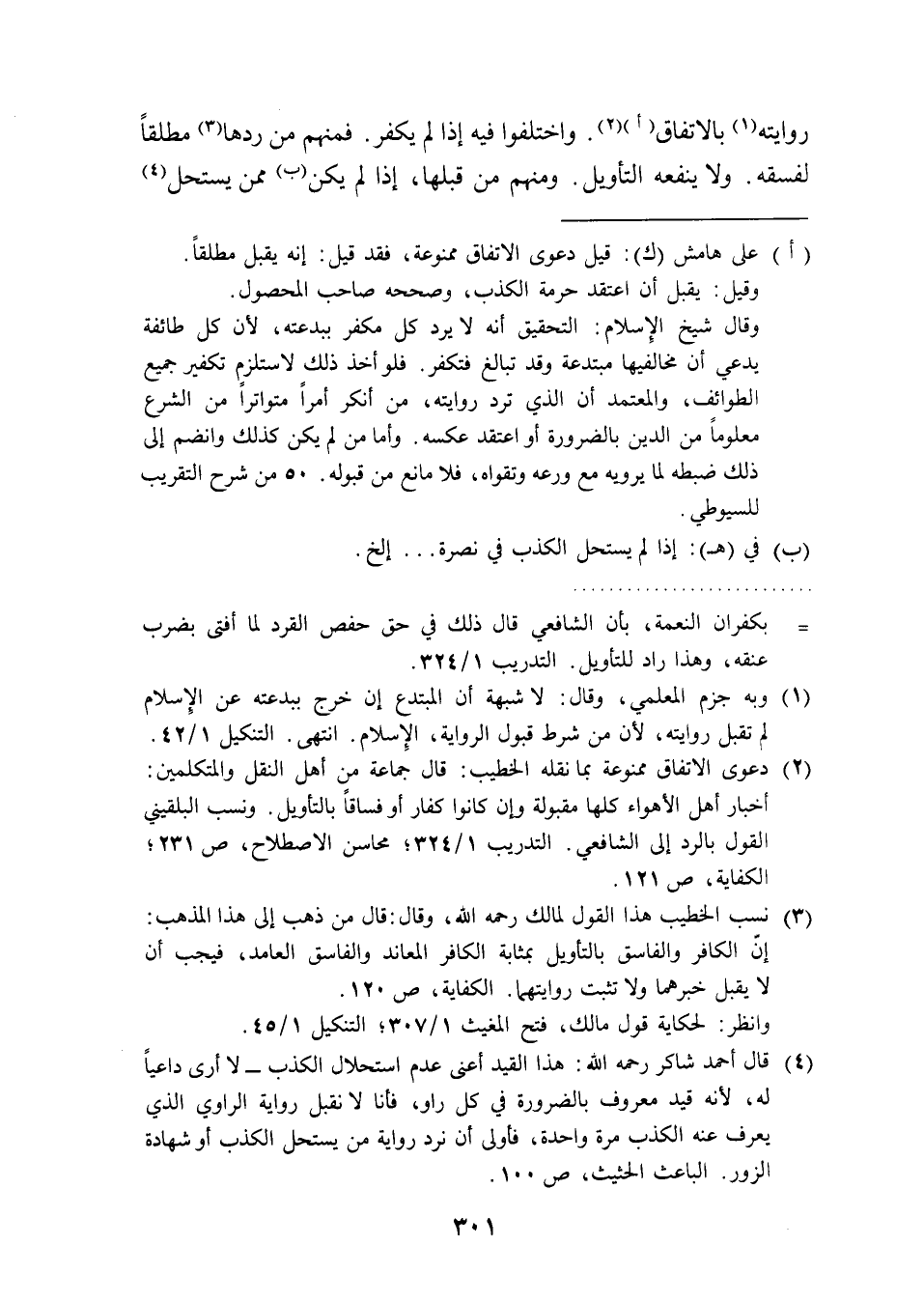 (¬4) قال أحمد شاكر رحمه الله: هذا القيد أعنى عدم استحلال الكذب - لا أرى داعيًا له، لأنه قيد معروف بالضرورة في كل راو، فأنا لا نقبل رواية الراوي الذي يعرف عنه الكذب مرة واحدة، فأولى أن نرد رواية من يستحل الكذب أو شهادة الزور. الباعث الحثيث، ص 100.