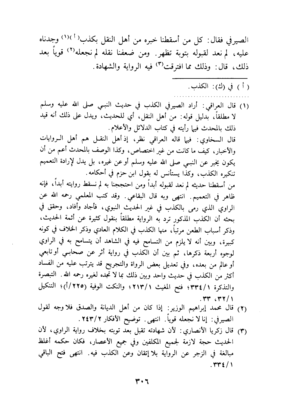 (¬1) قال العراقي: أراد الصيرفي الكذب في حديث النبي صلى الله عليه وسلم لا مطلقًا، بدليل قوله: من أهل النقل، أي للحديث، ويدل على ذلك أنه قيد ذلك بالمحدث فيما رأيته في كتاب الدلائل والأعلام.