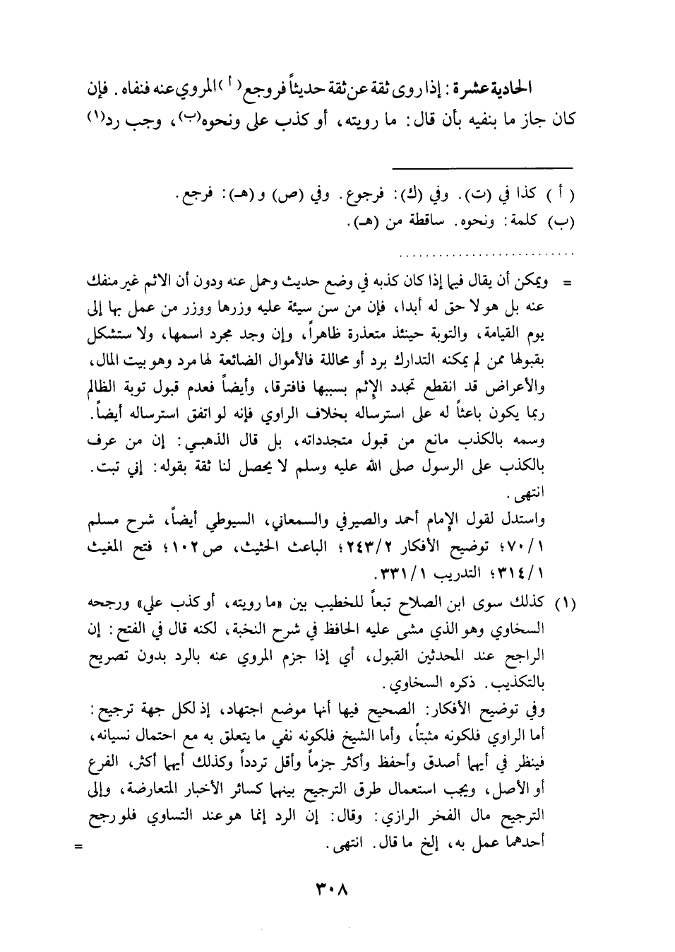 (¬1) كذلك سوى ابن الصلاح تبعًا للخطيب بين "ما رويته، أو كذب علي" ورجحه السخاوي وهو الذي مشى عليه الحافظ في شرح النخبة، لكنه قال في الفتح: إن الراجح عند المحدثين القبول، أي إذا جزم المروي عنه بالرد بدون تصريح بالتكذيب. ذكره السخاوي.