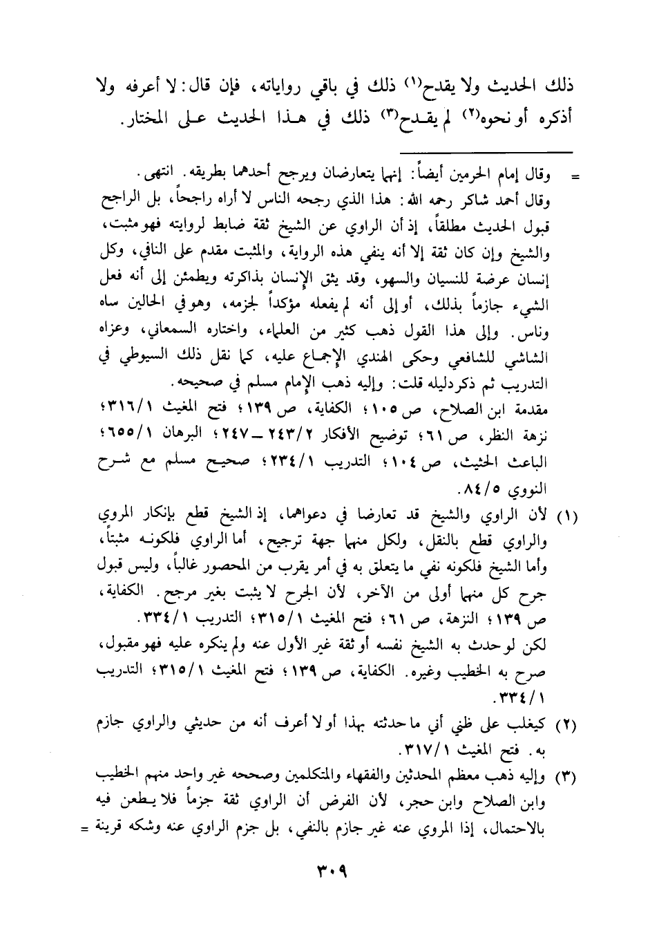 (¬1) لأن الراوي والشيخ قد تعارضا في دعواهما، إذ الشيخ قطع بإنكار المروي والراوي قطع بالنقل، ولكل منهما جهة ترجيح، أما الراوي فلكونه مثبتًا، وأما الشيخ فلكونه نفي ما يتعلق به في أمر يقرب من المحصور غالبًا، وليس قبول جرح كل منهما أولى من الآخر، لأن الجرح لا يثبت بغير مرجح. الكفاية، ص 139؛ النزهة، ص 61؛ فتح المغيث 1/ 315؛ التدريب 1/ 334.