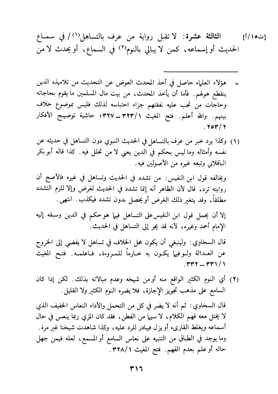 الثالثة عشرة: لا تقبل رواية من عرف بالتساهل (¬1) في سماع الحديث أو إسماعه، كمن لا يبالي بالنوم (¬2) في السماع، أو يحدث لا من