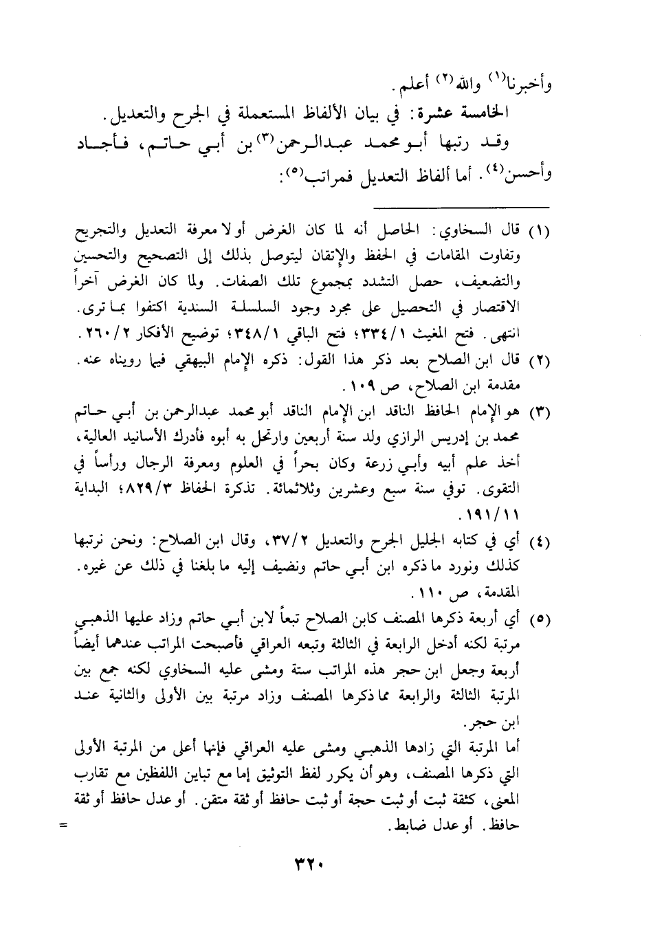 (¬4) أي في كتابه الجليل الجرح والتعديل 2/ 37، وقال ابن الصلاح: ونحن نرتبها كذلك ونورد ما ذكره ابن أبي حاتم ونضيف إليه ما بلغنا في ذلك عن غيره. المقدمة، ص 110.