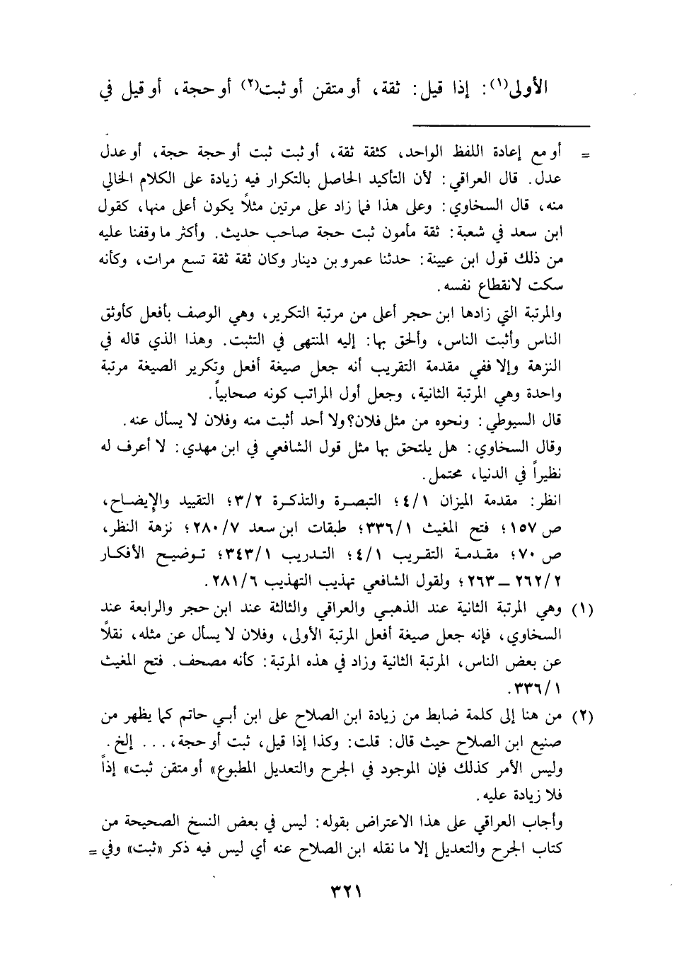 والمرتبة التي زادها ابن حجر أعلى من مرتبة التكرير، وهي الوصف بأفعل كأوثق الناس وأثبت الناس، وألحق بها: إليه المنتهى في التثبت. وهذا الذي قاله في النزهة وإلا ففي مقدمة التقريب أنه جعل صيغة أفعل وتكرير الصيغة مرتبة واحدة وهي المرتبة الثانية، وجعل أول المراتب كونه صحابيًا.