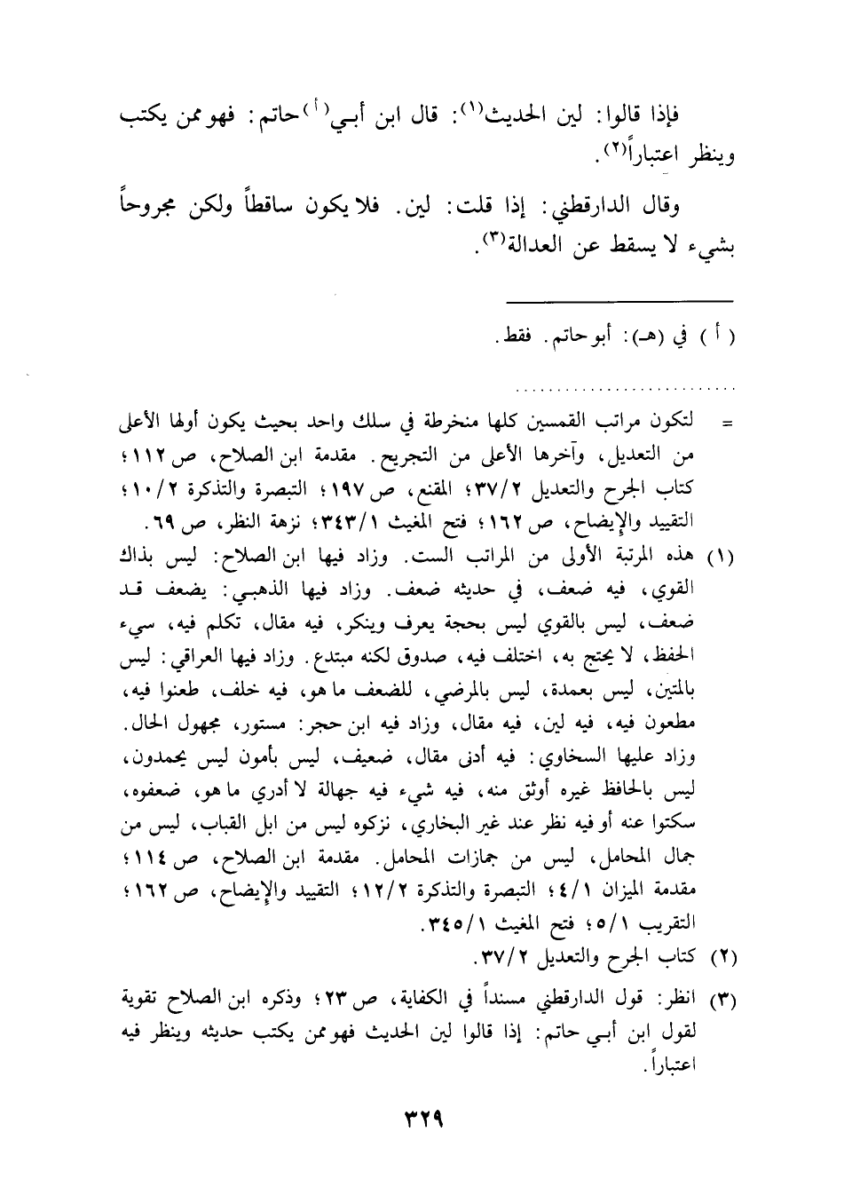 (¬3) انظر: قول الدارقطني مسندًا في الكفاية، ص 23؛ وذكره ابن الصلاح تقوية لقول ابن أبي حاتم: إذا قالوا لين الحديث فهو ممن يكتب حديثه وينظر فيه اعتبارًا.