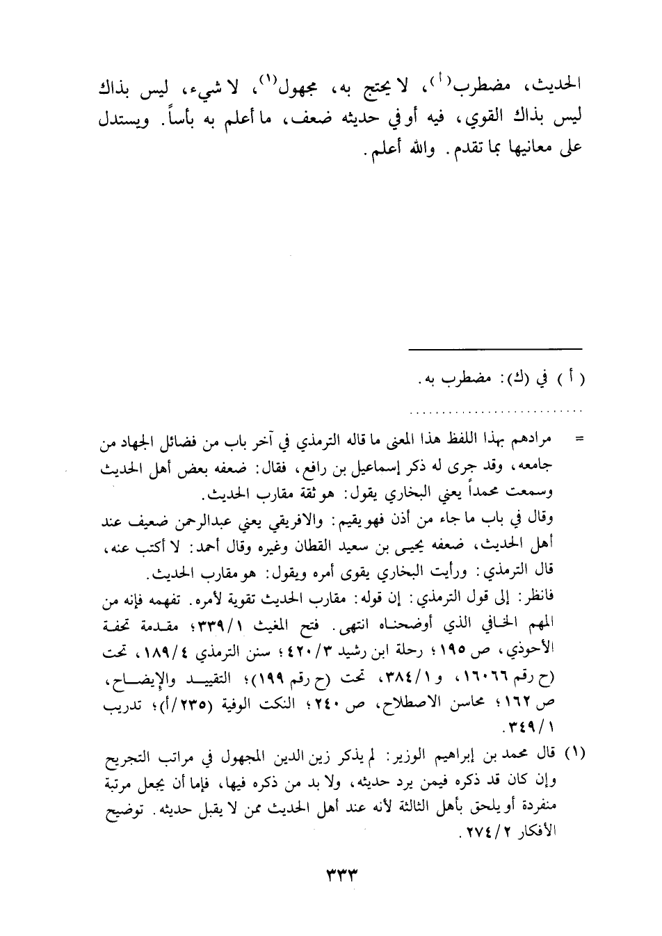 فانظر: إلى قول الترمذي: إن قوله: مقارب الحديث تقوية لأمره. تفهمه فإنه من المهم الخافي الذي أوضحناه انتهى. فتح المغيث 1/ 339؛ مقدمة تحفة الأحوذي، ص 195؛ رحلة ابن رشيد 3/ 420؛ سنن الترمذي 4/ 189، تحت (ح رقم 16066، و 1/ 384، تحت (ح رقم 199)؛ التقييد والإِيضاح، ص 162؛ محاسن الاصطلاح، ص 240؛ النكت الوفية (235/ أ)؛ تدريب 1/ 349.