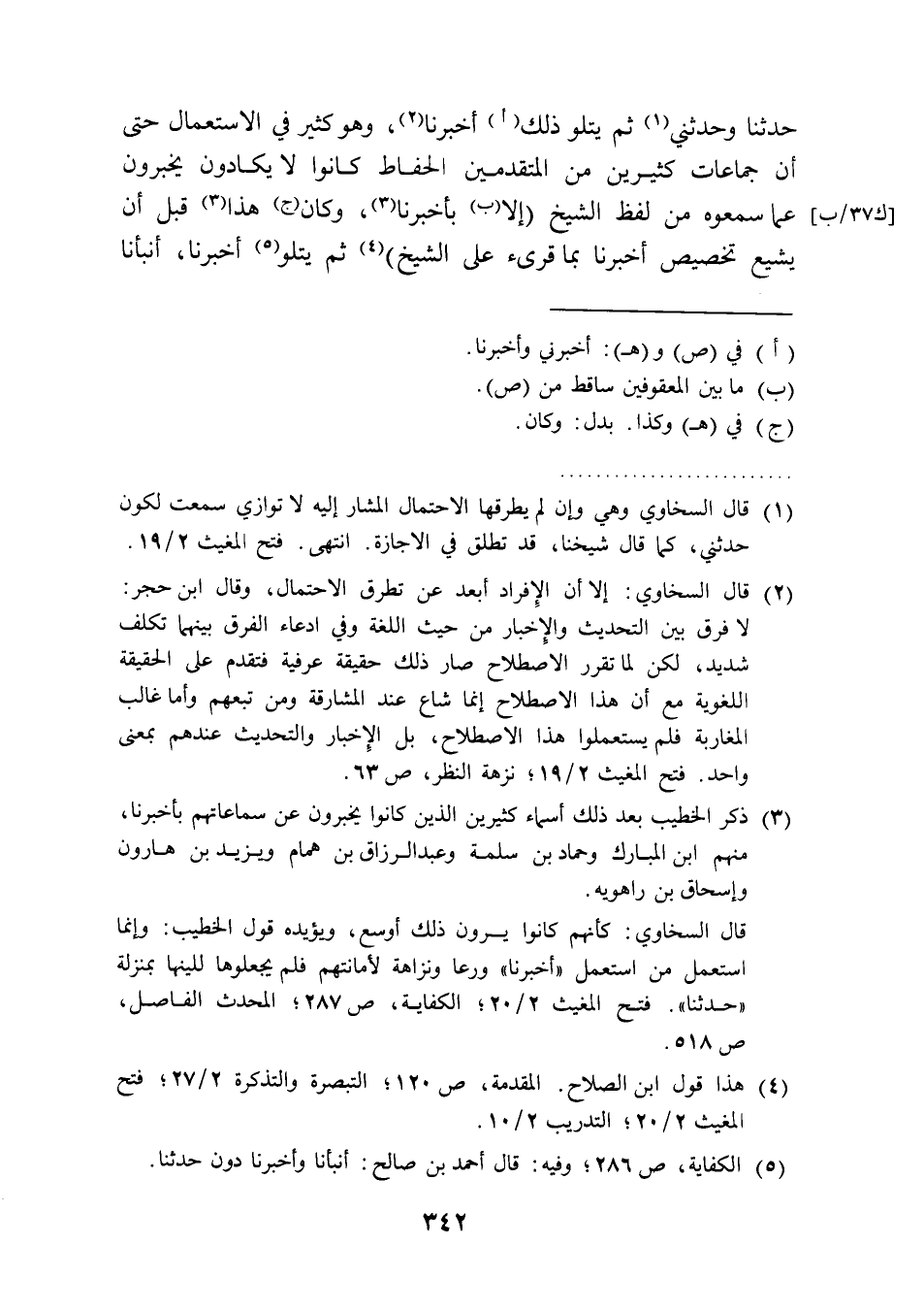 حدثنا وحدثني (¬1) ثم يتلو ذلك (أ) أخبرنا (¬2)، وهو كثير في الاستعمال حتى أن جماعات كثيرين من المتقدمين الحفاط كانوا لا يكادون يخبرون عما سمعوه من لفظ الشيخ (إلا (ب) بأخبرنا (¬3)، وكان (ج) هذا (3) قبل أن يشيع تخصيص أخبرنا بما قرئ على الشيخ) (¬4) ثم يتلو (¬5) أخبرنا، أنبأنا