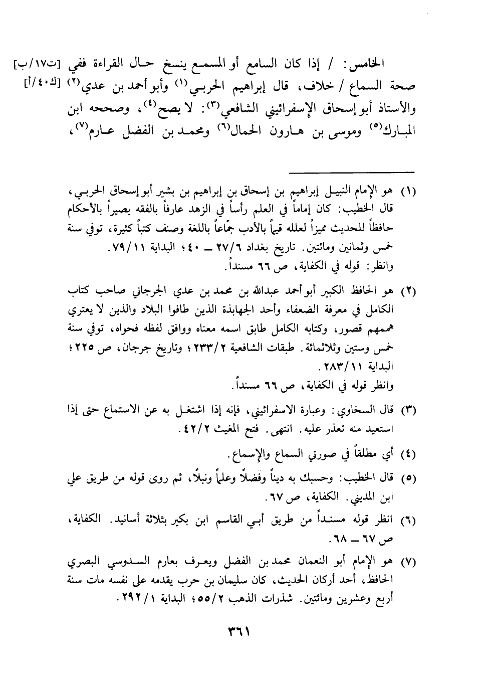 الخامس: إذا كان السامع أو المسمع ينسخ حال القراءة ففي صحة السماع خلاف، قال إبراهيم الحربي (¬1) وأبو أحمد بن عدي (¬2) والأستاذ أبو إسحاق الإِسفرائيني الشافعي (¬3): لا يصح (¬4)، وصححه ابن المبارك (¬5) وموسى بن هارون الحمال (¬6) ومحمد بن الفضل عارم (¬7)،