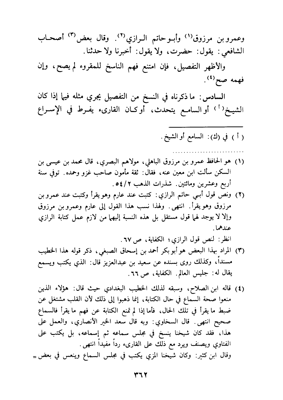 (¬4) قاله ابن الصلاح، وسبقه لذلك الخطيب البغدادي حيث قال: هؤلاء الذين منعوا صحة السماع في حال الكتابة، إنما ذهبوا إلى ذلك لأن القلب مشتغل عن ضبط ما يقرأ في تلك الحال، فأما إذا لم تمنع الكتابة عن فهم ما يقرأ فالسماع صحيح انتهى. قال السخاوي: وبه قال سعد الخير الأنصاري، والعمل على هذا، فقد كان شيخنا ينسخ في مجلس سماعه ثم إسماعه، بل يكتب على الفتاوي ويصنف ويرد مع ذلك على القارئ ردًا مفيدًا انتهى.