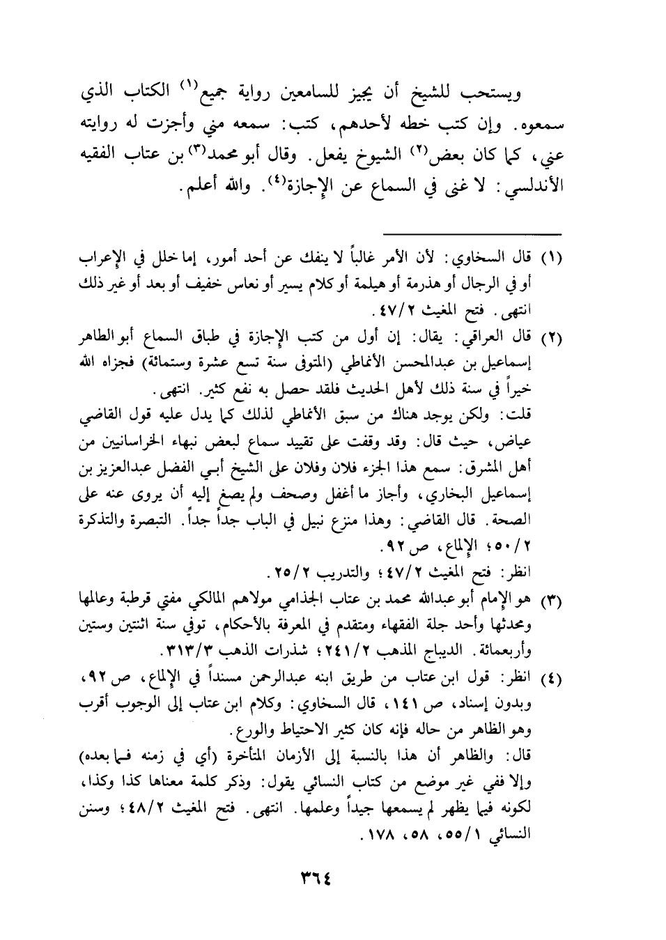 (¬4) انظر: قول ابن عتاب من طريق ابنه عبد الرحمن مسندًا في الإِلماع، ص 92، وبدون إسناد، ص 141، قال السخاوي: وكلام ابن عتاب إلى الوجوب أقرب وهو الظاهر من حاله فإنه كان كثير الاحتياط والورع.