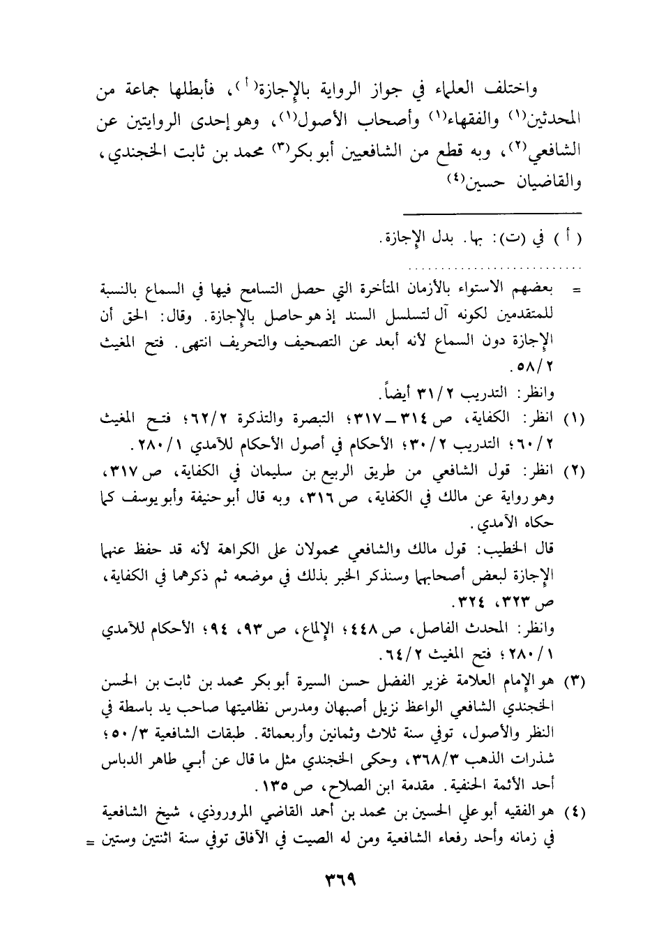(¬1) انظر: الكفاية، ص 314 - 317؛ التبصرة والتذكرة 2/ 62؛ فتح المغيث 2/ 60؛ التدريب 2/ 30؛ الأحكام في أصول الأحكام للآمدي 1/ 280.