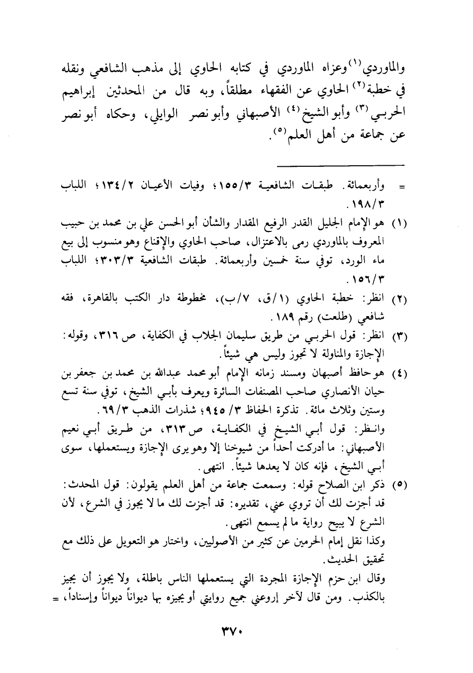 وانظر: قول أبي الشيخ في الكفاية، ص 313، من طريق أبي نعيم الأصبهاني: ما أدركت أحدًا من شيوخنا إلا وهو يرى الإِجازة ويستعملها، سوى أبي الشيخ، فإنه كان لا يعدها شيئًا. انتهى.