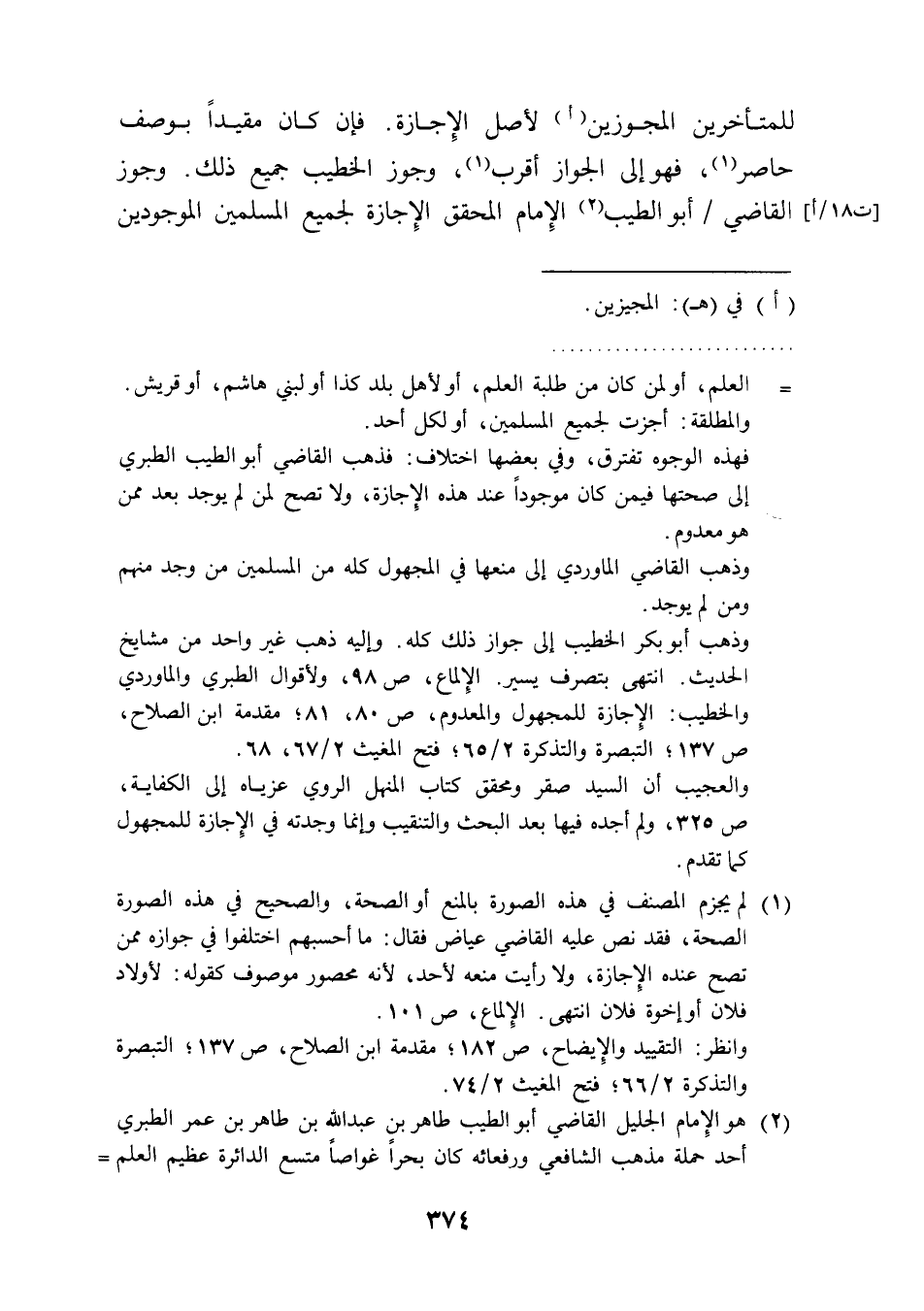 للمتأخرين المجوزين (أ) لأصل الإِجازة. فإن كان مقيدًا بوصف حاصر (¬1)، فهو إلى الجواز أقرب (1)، وجوز الخطيب جميع ذلك. وجوز القاضي أبو الطيب (¬2) الإِمام المحقق الإِجازة لجميع المسلمين الموجودين