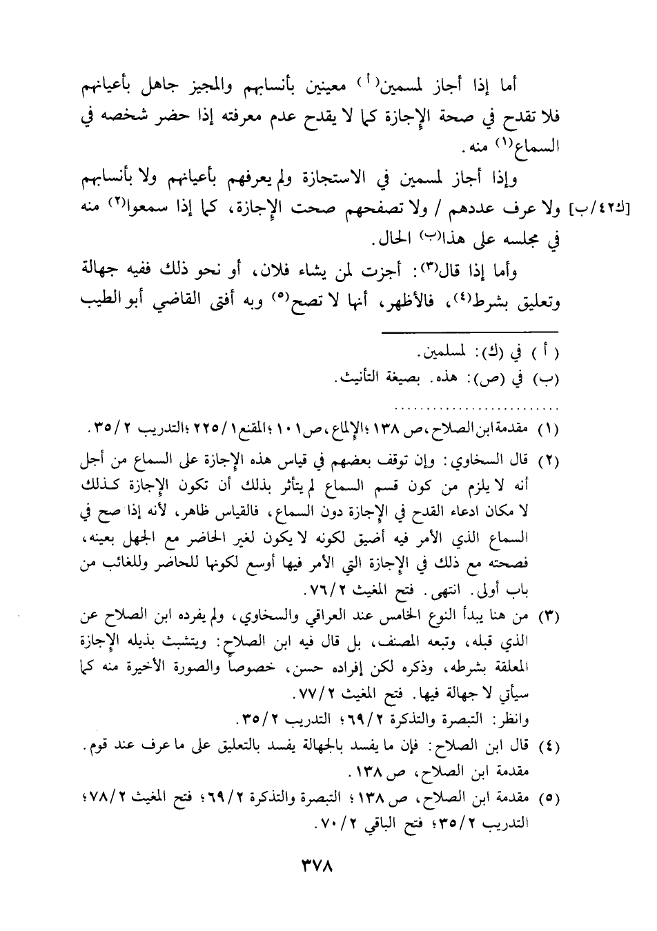 (¬2) قال السخاوي: وإن توقف بعضهم في قياس هذه الإِجازة على السماع من أجل أنه لا يلزم من كون قسم السماع لم يتأثر بذلك أن تكون الإِجازة كذلك لا مكان ادعاء القدح في الإِجازة دون السماع، فالقياس ظاهر، لأنه إذا صح في السماع الذي الأمر فيه أضيق لكونه لا يكون لغير الحاضر مع الجهل بعينه، فصحته مع ذلك في الإِجازة التي الأمر فيها أوسع لكونها للحاضر وللغائب من باب أولى. انتهى. فتح المغيث 2/ 76.