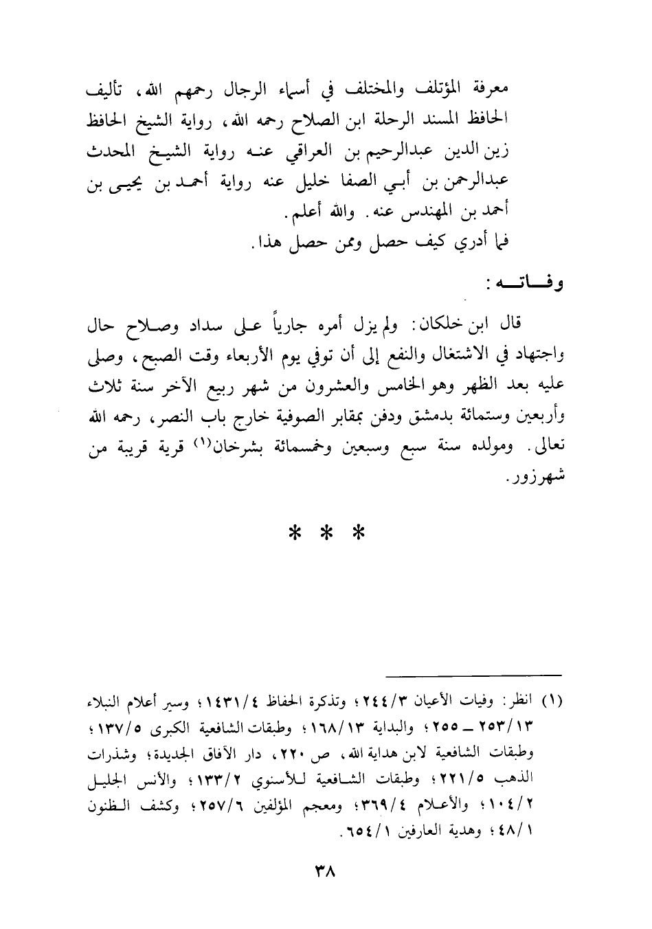 معرفة المؤتلف والمختلف في أسماء الرجال رحمهم الله، تأليف الحافظ المسند الرحلة ابن الصلاح رحمه الله، رواية الشيخ الحافظ زين الدين عبد الرحيم بن العراقي عنه رواية الشيخ المحدث عبد الرحمن بن أبي الصفا خليل عنه رواية أحمد بن يحيى بن أحمد بن المهندس عنه. والله أعلم.