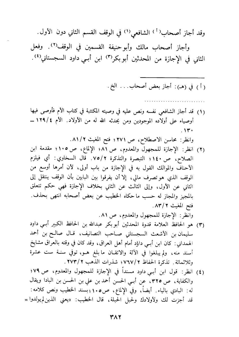 (¬2) انظر: الإِجازة للمجهول والمعدوم، ص 81؛ الإِلماع، ص 105؛ مقدمة ابن الصلاح، ص 140؛ التبصرة والتذكرة 2/ 75. قال السخاوي: أي فيلزم الأحناف والموالك القول به في الإِجازة من باب أولى، لأن أمرها أوسع من الوقف الذي هو تصرف مالي، إلا أن يفرقوا بين البابين بأن الوقف ينتقل إلى الثاني عن الأول، وإلى الثالث عن الثاني بخلاف الإِجازة فهي حكم تتعلق بالمجيز والمجاز له حسب ما حكاه الخطيب عن بعض أصحابه انتهى بحذف. فتح المغيث 2/ 83.