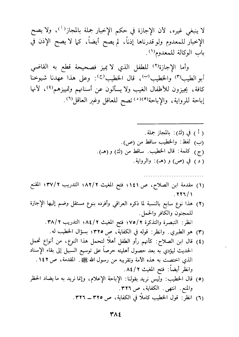 وأما الإِجازة (¬2) للطفل الذي لا يميز فصحيحة قطع به القاضي أبو الطيب (¬3) والخطيب (ب)، قال الخطيب (ج): وعلى هذا عهدنا شيوخنا كافة، يجيزون للأطفال الغيب ولا يسألون عن أسنانهم وتمييزهم (¬4)، لأنها إباحة للرواية، والإِباحة (¬5) (د) تصح للعاقل وغير العاقل (¬6).