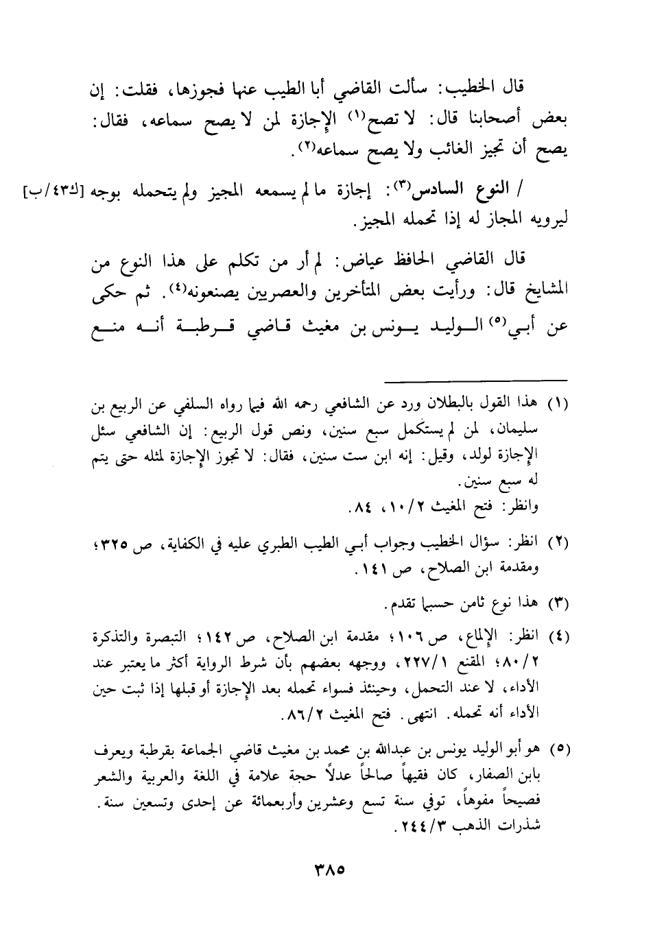 (¬2) انظر: سؤال الخطيب وجواب أبي الطيب الطبري عليه في الكفاية، ص 325؛ ومقدمة ابن الصلاح، ص 141.