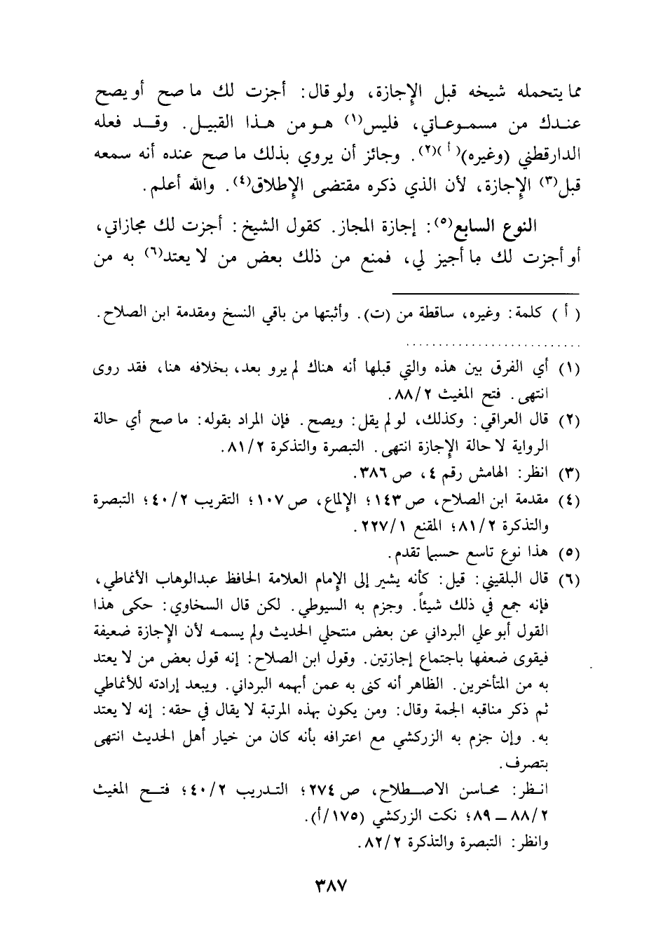 (¬2) قال العراقي: وكذلك، لو لم يقل: ويصح. فإن المراد بقوله: ما صح أي حالة الرواية لا حالة الإِجازة انتهى. التبصرة والتذكرة 2/ 81.
