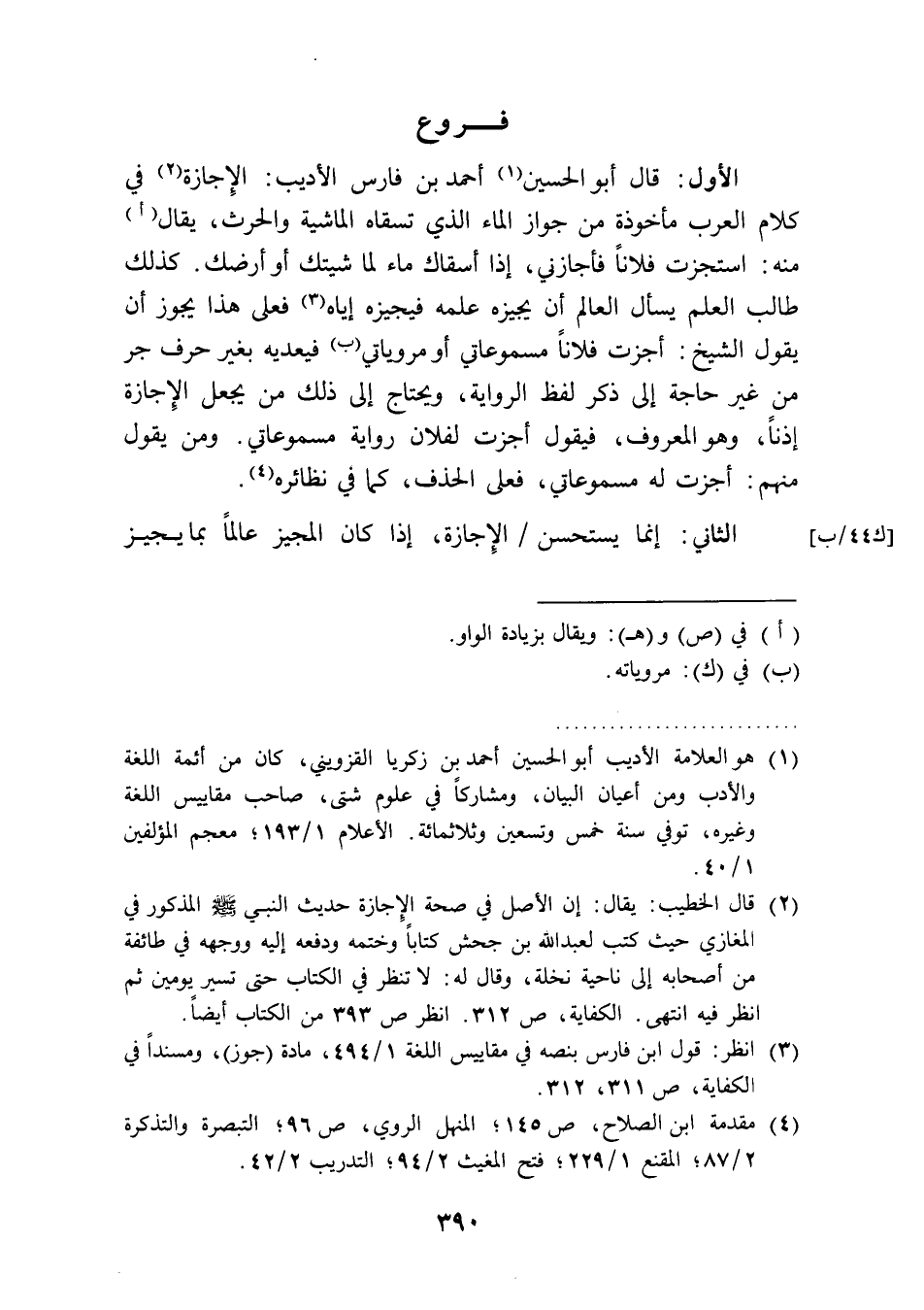 الأول: قال أبو الحسين (¬1) أحمد بن فارس الأديب: الإِجازة (¬2) في كلام العرب مأخوذة من جواز الماء الذي تسقاه الماشية والحرث، يقال (أ) منه: استجزت فلانًا فأجازني، إذا أسقاك ماء لماشيتك أو أرضك. كذلك طالب العلم يسأل العالم أن يجيزه علمه فيجيزه إياه (¬3) فعلى هذا يجوز أن يقول الشيخ: أجزت فلانًا مسموعاتي أو مروياتي (ب) فيعديه بغير حرف جر من غير حاجة إلى ذكر لفظ الرواية، ويحتاج إلى ذلك من يجعل الإِجازة إذنًا، وهو المعروف، فيقول أجزت لفلان رواية مسموعاتي. ومن يقول منهم: أجزت له مسموعاتي، فعلى الحذف، كما في نظائره (¬4).