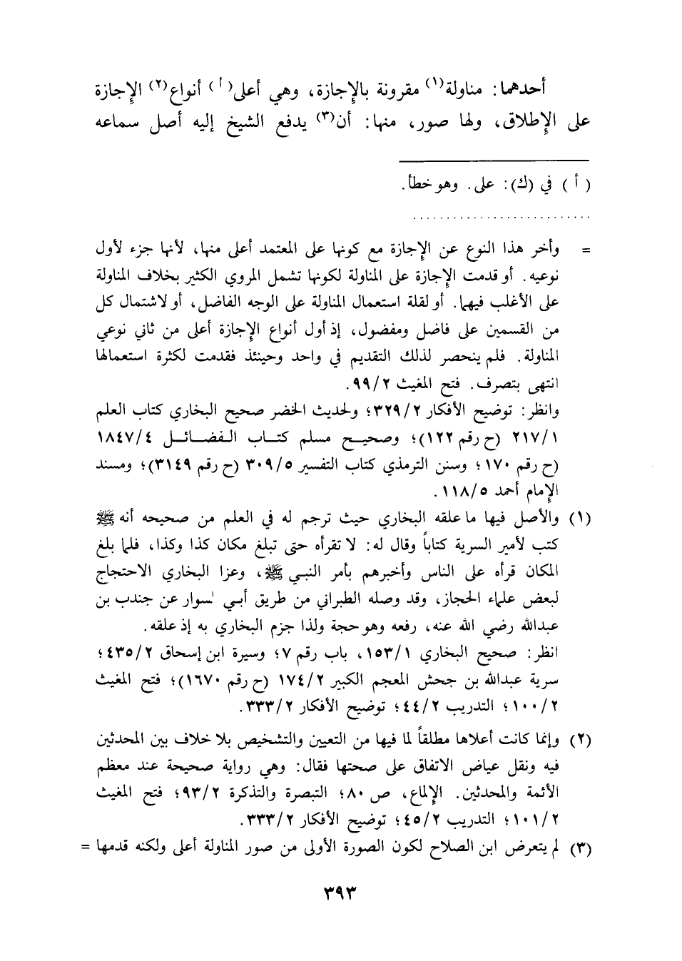 = وأخر هذا النوع عن الإِجازة مع كونها على المعتمد أعلى منها، لأنها جزء لأول نوعيه. أو قدمت الإِجازة على المناولة لكونها تشمل المروي الكثير بخلاف المناولة على الأغلب فيهما. أو لقلة استعمال المناولة على الوجه الفاضل، أو لاشتمال كل من القسمين على فاضل ومفضول، إذ أول أنواع الإِجازة أعلى من ثاني نوعي المناولة. فلم ينحصر لذلك التقديم في واحد وحينئذ فقدمت لكثرة استعمالها انتهى بتصرف. فتح المغيث 2/ 99.